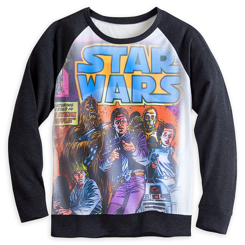 The Disney Store website has four new women’s Star Wars apparel items available. There is a women’s football-style tee featuring the Millennium Falcon, a women’s tank top with print of Darth Vader’s helmet, a women’s long sleeve raglan tee featuring colorful comic book artwork, and women’s sweatpants with a repeating print of Stormtrooper helmets. The tops are available in sizes XS to XXL, while the sweatpants are available in sizes S to XL. Prices range from US$32.95 to US$36.95 – the Disney Store can ship internationally, which is great.