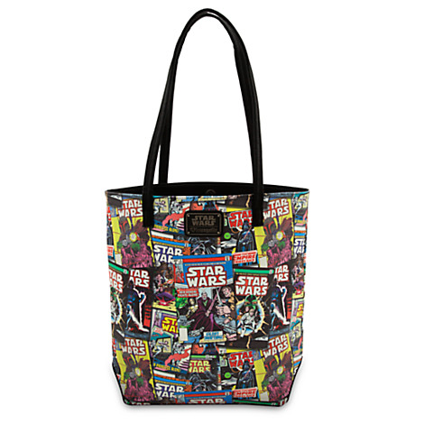 The Disney Store has a couple of new women’s Star Wars items available. The first new item is a women’s t-shirt with a metallic ink print of the Star Wars logo and starry background. The t-shirt is available in sizes XS to XXL and is priced at US$22.95 each. The second new item is the Loungefly comic tote bag, priced at US$59.95 each – the Disney Store can ship internationally.