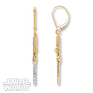 Kay Jewelers has added two more new items to their Star Wars jewelry range. The first new item is a sterling silver TIE Fighter bangle bracelet, which features Darth Vader’s TIE Advanced set in a bangle. The second new item is a pair of 10K yellow gold lightsaber earrings (the hilt is either Darth Vader or Anakin Skywalker’s), with diamonds on the blade and Euro-wire hooks. The bangle is priced at US$169.00 each, while the earrings are priced at US$349.00 per pair. It appears that Kay Jewelers do not ship outside the US, but international fans can use the ‘personal shopper’ service available from mail forwarding companies to purchase from the website. I love both of these new designs – it’s great to see that Kay Jewelers are still adding new items to their range.