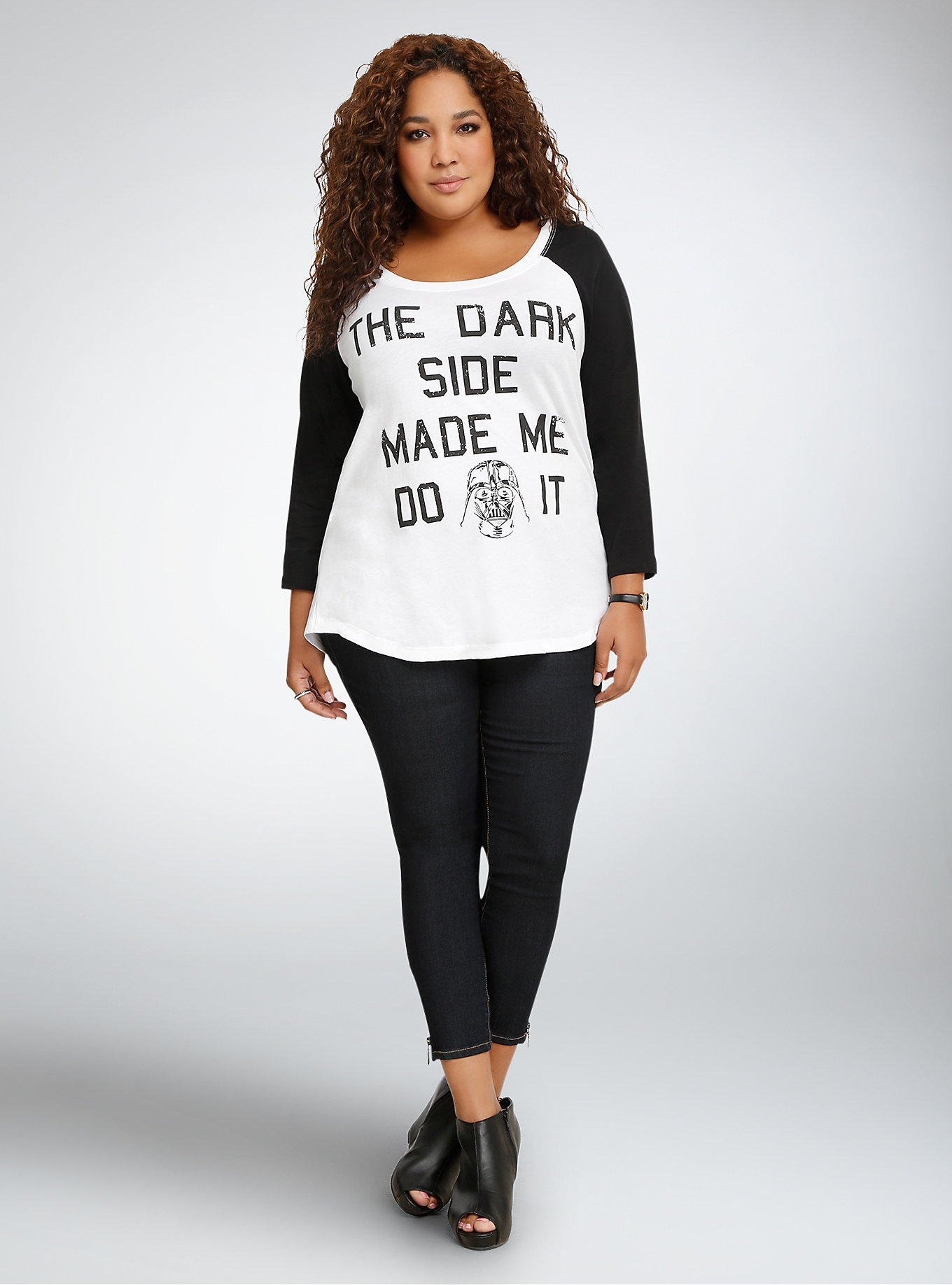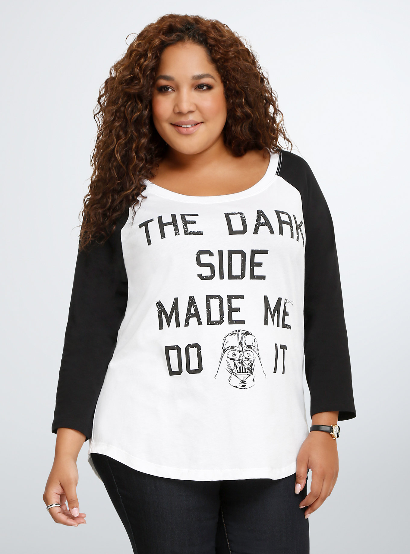 Torrid has a few new women’s Star Wars items available. The first is a black and white raglan 3/4 sleeve t-shirt, that features the text ‘The Dark Side Made Me Do It’ with Darth Vader on the front. Available in plus sizes 0 to 6, the t-shirt is priced at US$38.50 each. The other new items include two styles of Star Wars watches – one features the Star Wars logo, while the other features Darth Vader – both are priced at US$34.50 each. Torrid currently has a site wide promotion of 30% off with the code ‘INAFLASH’ – they can ship internationally.