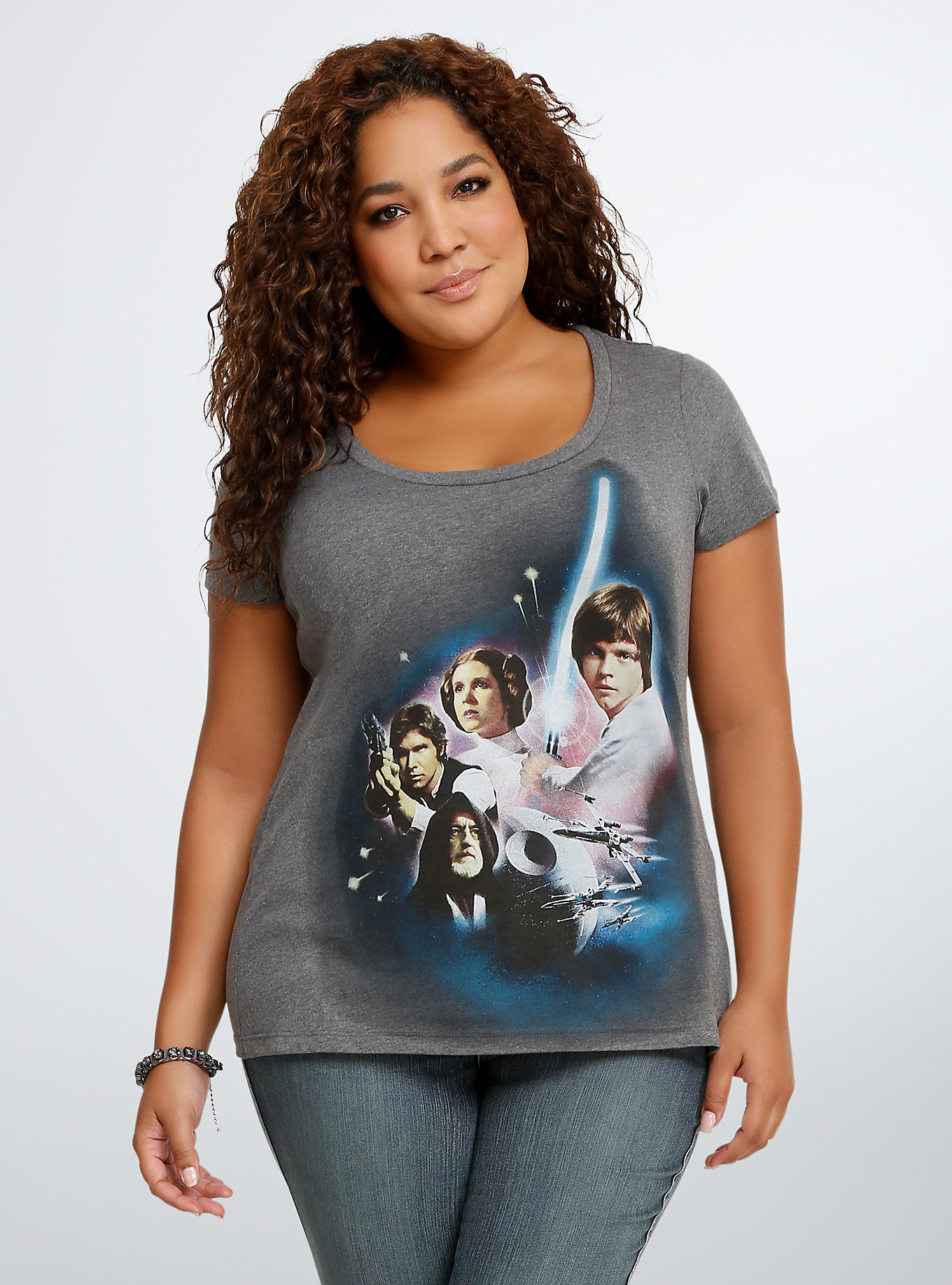 Torrid has a new women’s plus size Star Wars t-shirt available. The gray scoop neck t-shirt features artwork of characters from A New Hope (used as the ‘A New Hope’ dvd cover in 2004). Available in plus sizes 0 to 5, the t-shirt is priced at US$34.50 – get 25% off with the code ‘GETSEXY’ (also applies to other apparel). Torrid also has the two new Loungefly ‘sugar skull’ style Darth Vader and Stormtrooper coin purses, priced at US$26.50 each – Torrid can ship internationally.