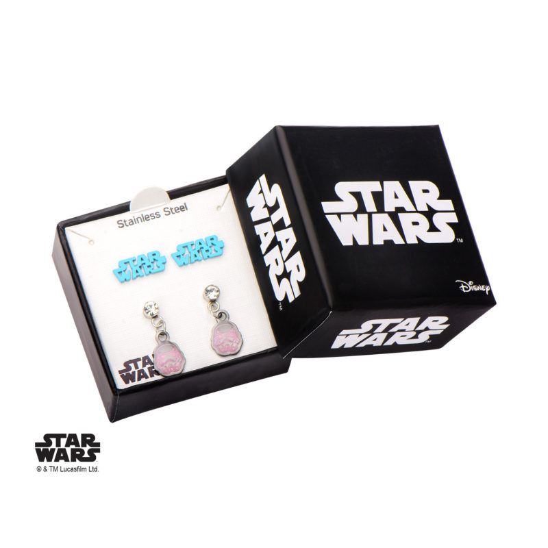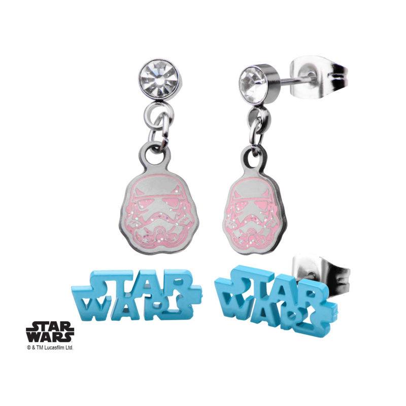 Body Vibe has a new Star Wars stud earring set available. Made from Stainless Steel, the set includes 2 pairs of stud earrings. The first pair features a clear rhinestone detail and hanging pink Stormtrooper helmet, while the second pair features a blue Star Wars cutout logo.