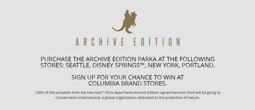 Columbia is also producing a Han Solo Archive Edition parka modelled after the dark brown coat Harrison Ford wore in some of the Hoth scenes from “Empire”. These special Han Solo Archive Edition parkas are extremely limited, and will be sold at the Columbia branded stores in Portland, Seattle, New York and Disney Springs.