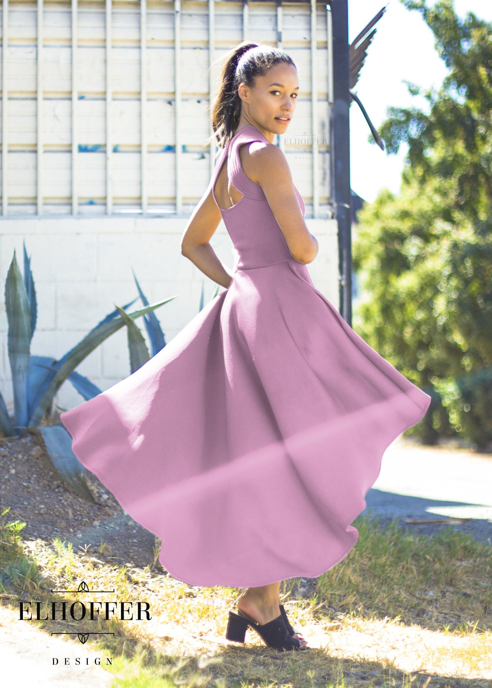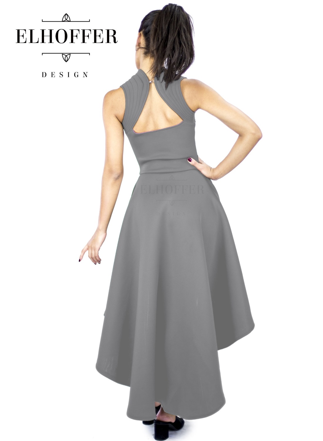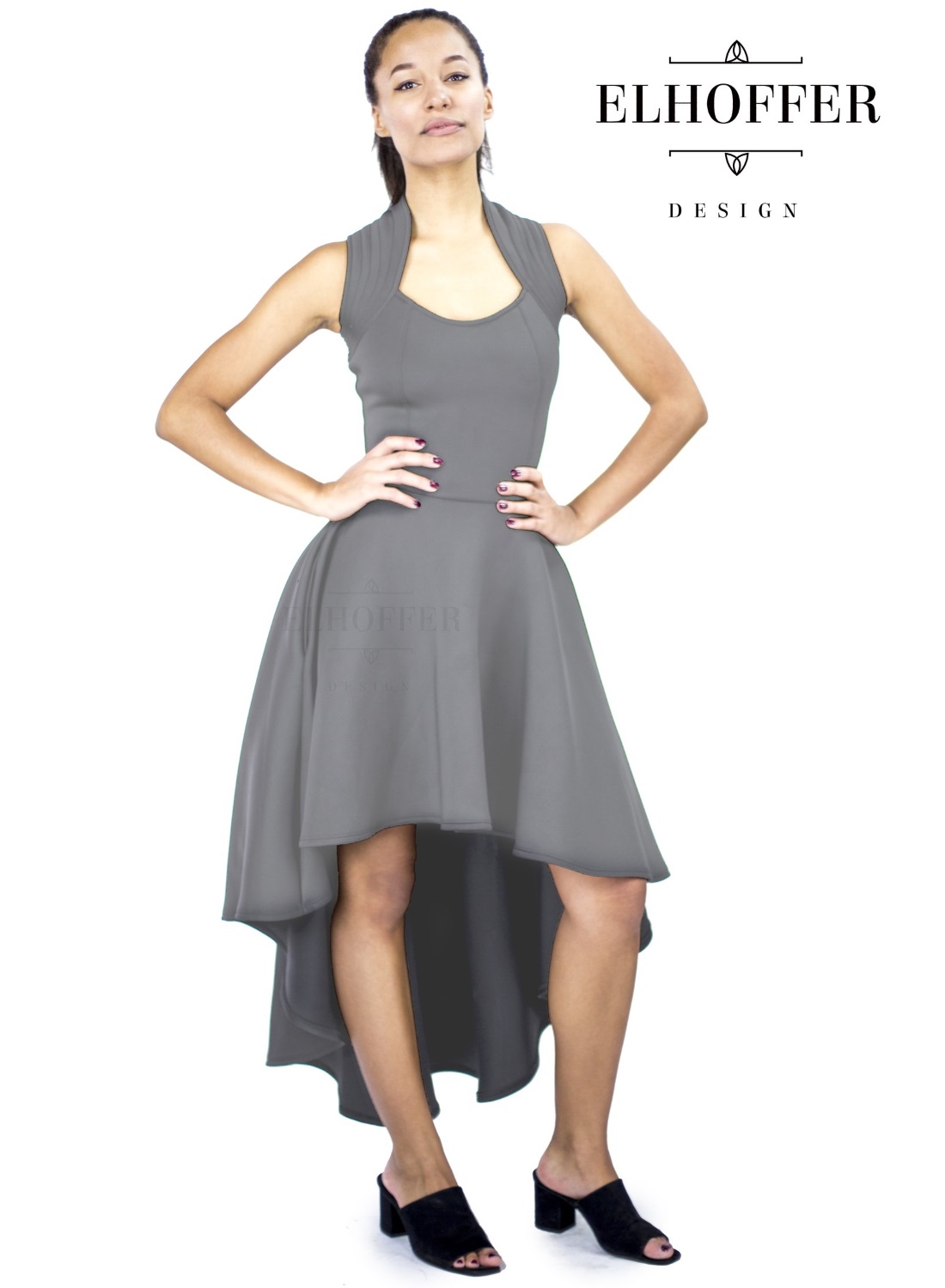 Made from Super Techno, this grey fabric is super plushy and has a built in structure for the skirt. The dress has princess seams, quilted shoulder detail, side seam pockets, and a hi-low skirt. The shoulder detail is virtually a racer-front shoulder line with a high neck curve. A low scoop neck in front and a straight cut in the back keep the lines on the top of the dress extreme and flattering.