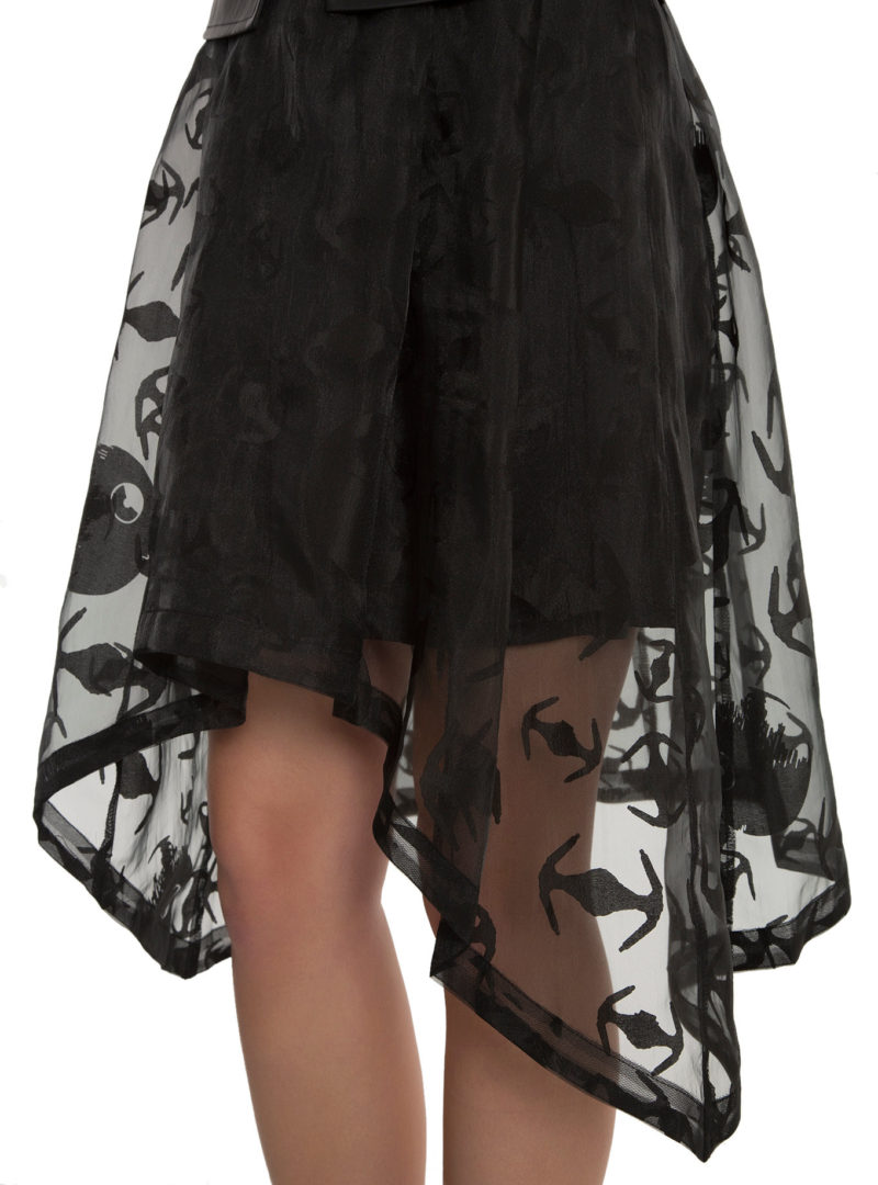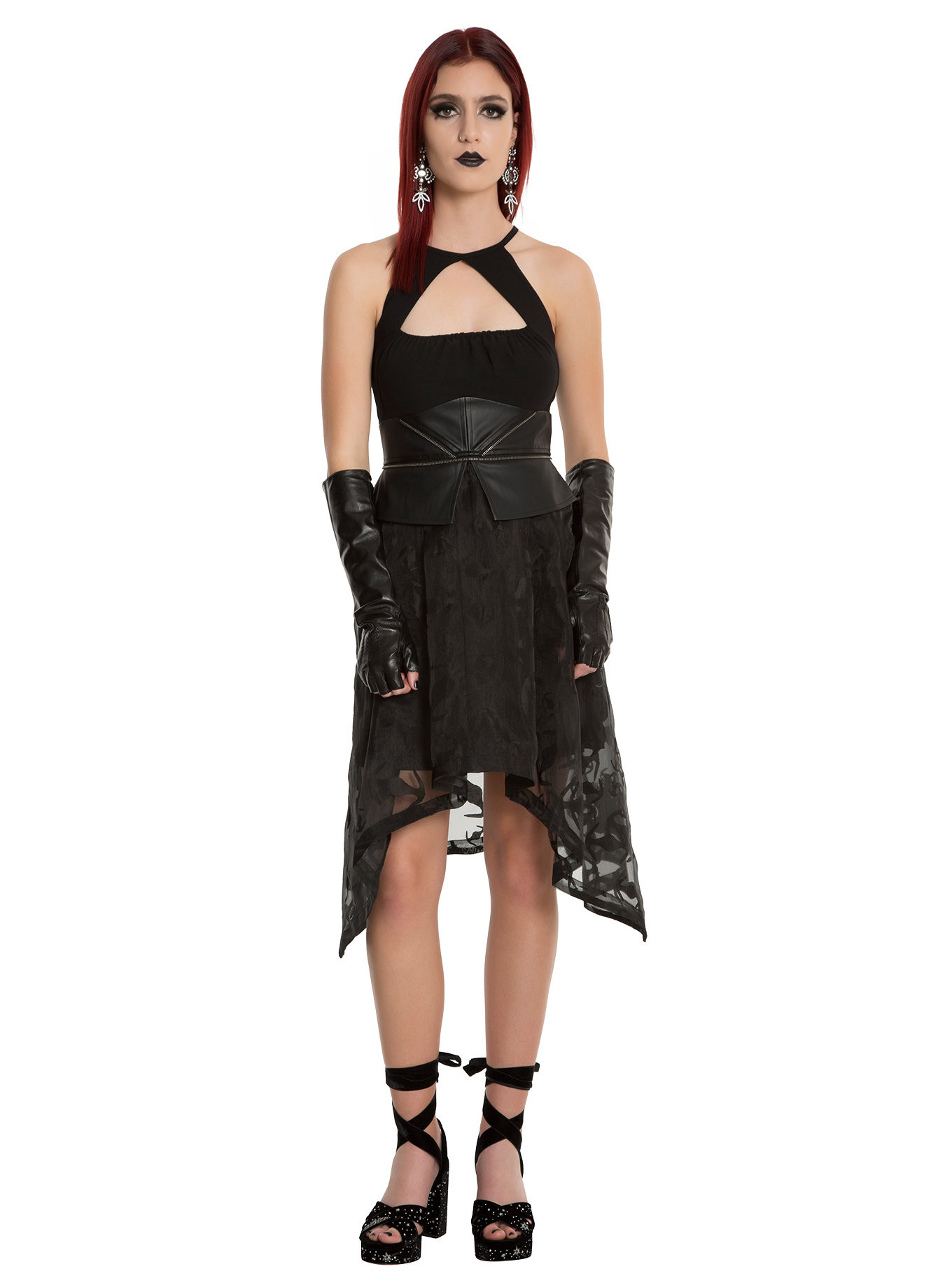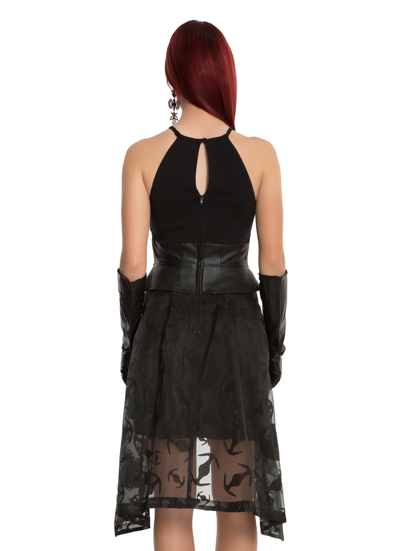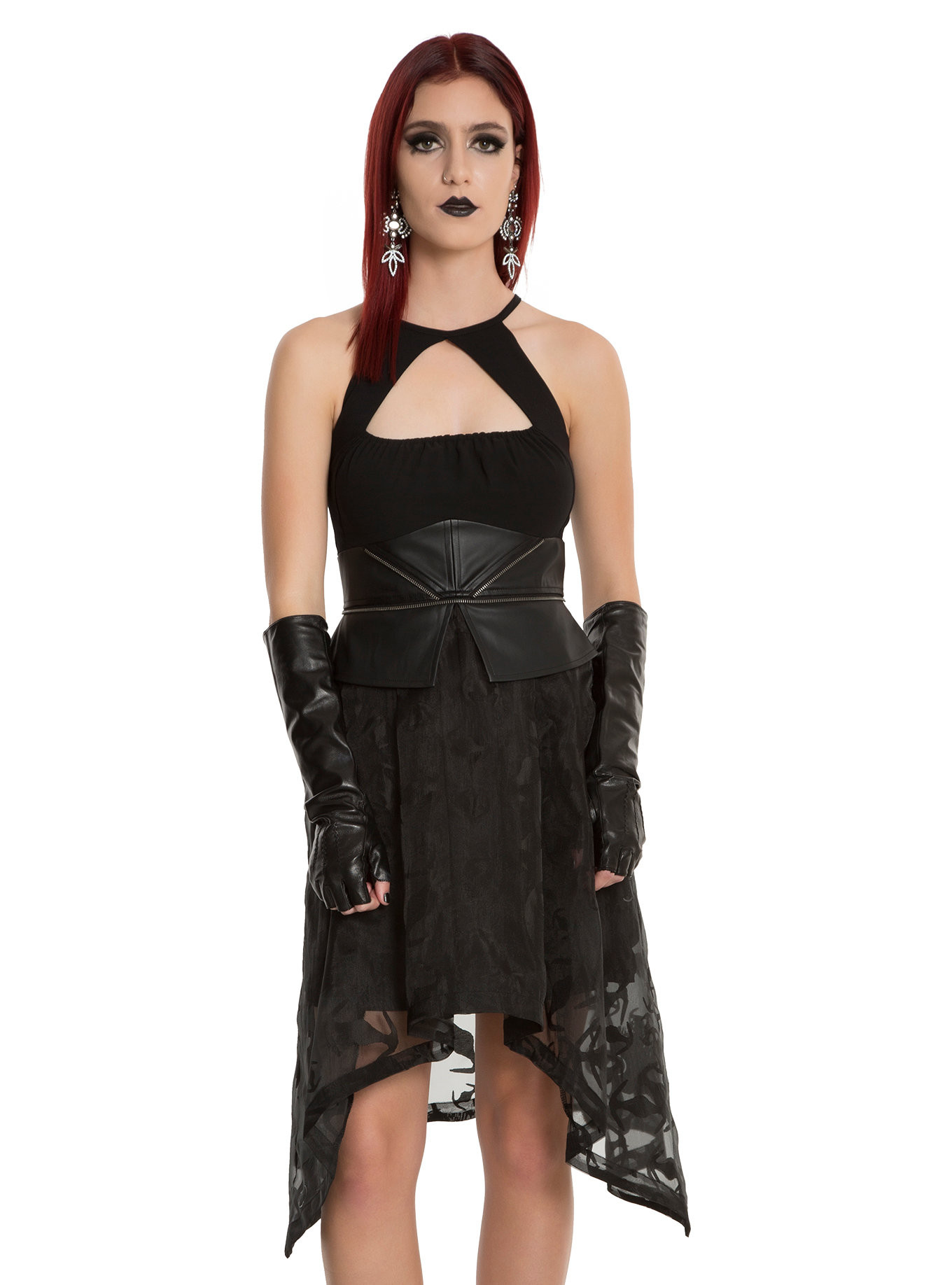 You’ll never want to leave the Dark Side once you slip into this gown! It’s inspired by Darth Vader himself, and is the perfect solution for all your LBD needs. The high halter neck bodice has a gathered elastic neckline with a back keyhole detail and a cloth covered button closure. The fitted waistband is covered in buttery soft faux leather and is accented with silver tone industrial zipper teeth piping and flows into the hi-low hem sharkbite skirt with a pointed peplum detail. An organza overlay skirt mimics the shape of Vader’s helmet and is subtly printed with various ships from the movies. Fully lined. Back zipper closure.