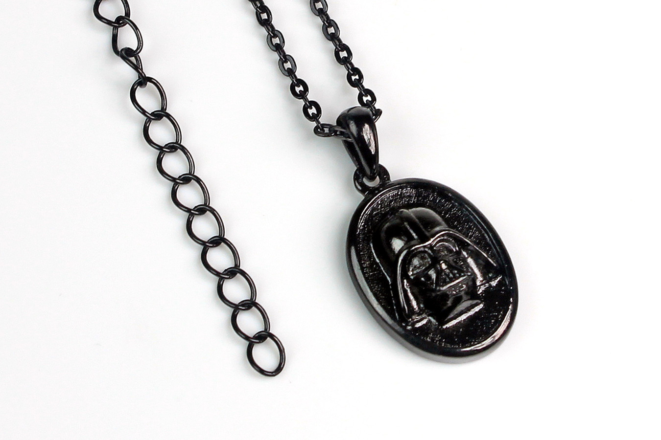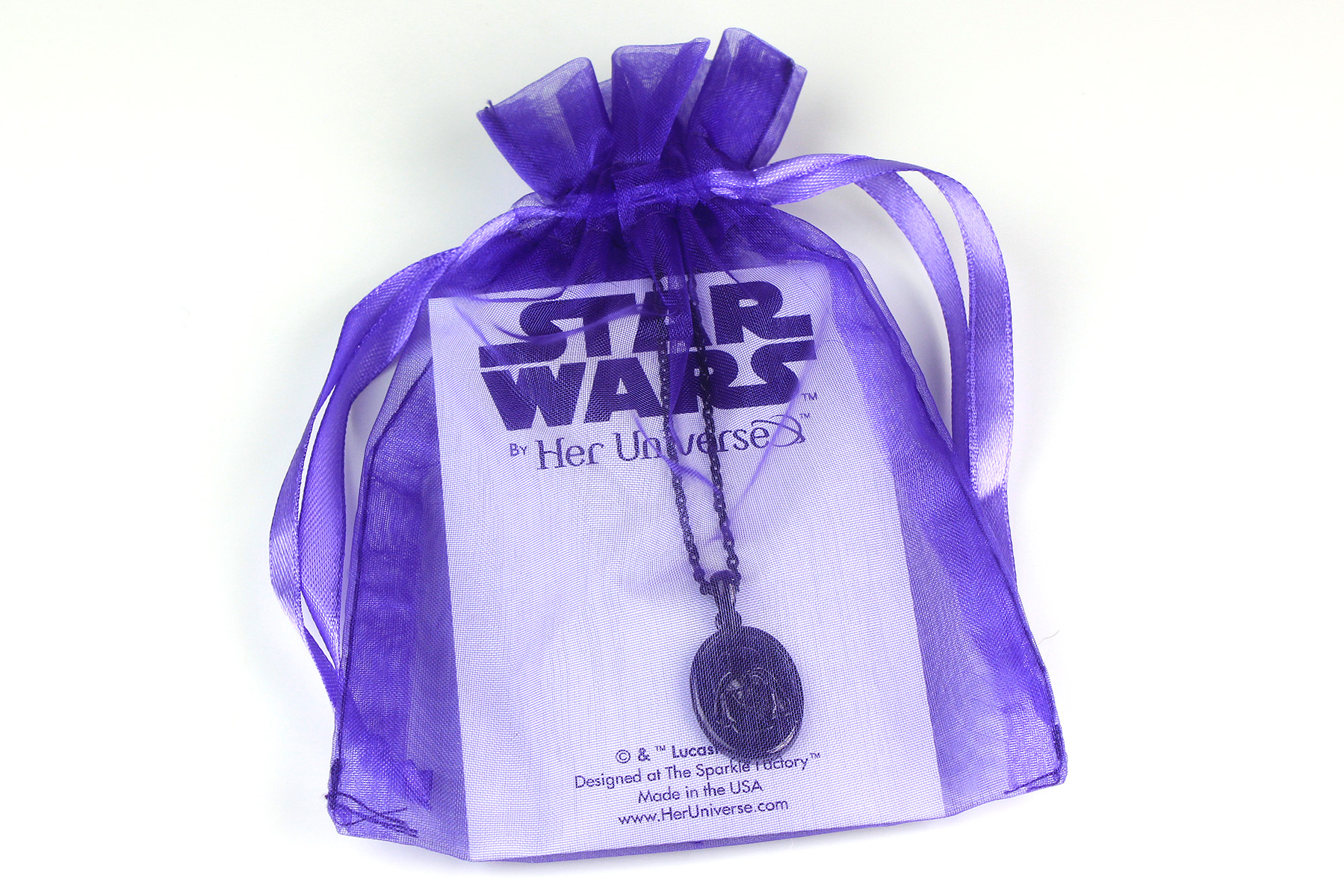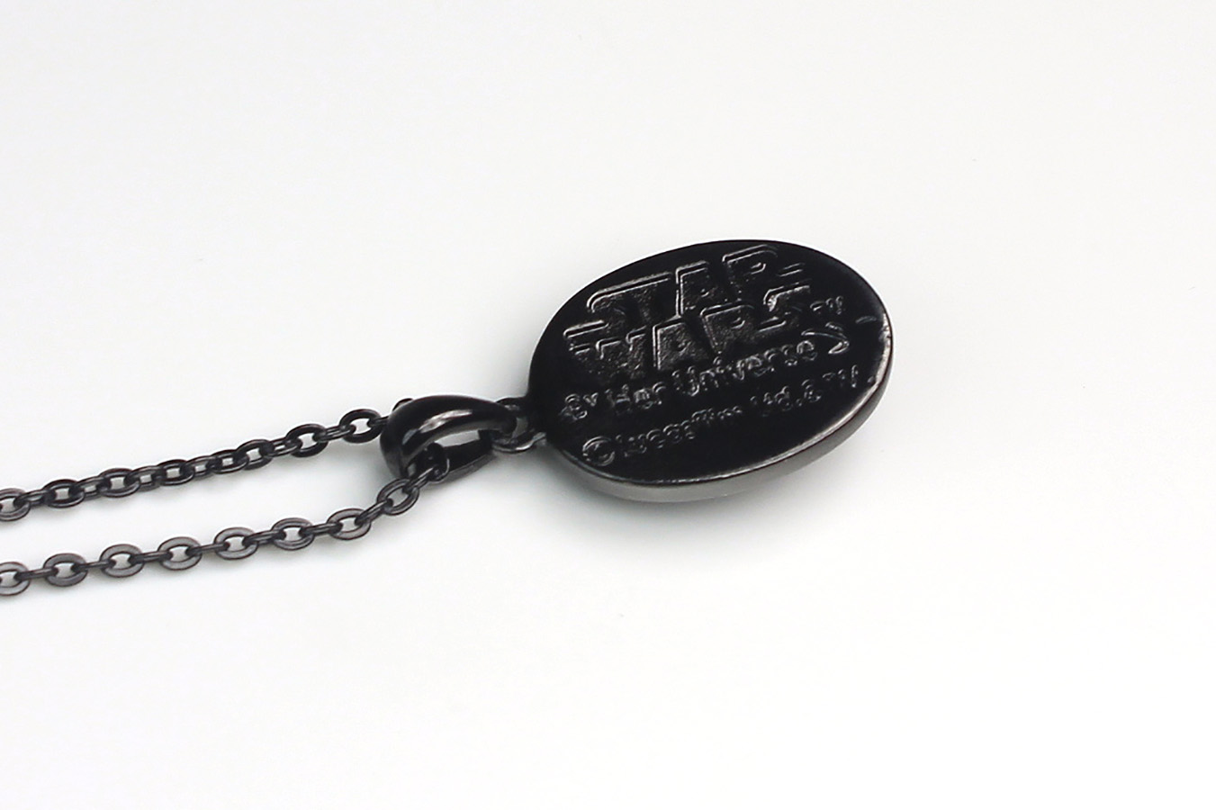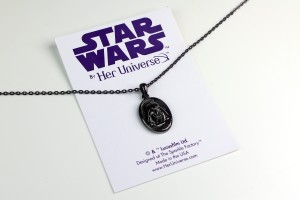 The Darth Vader pendant necklace also features a 3D Darth Vader helmet sculpt against an oval pendant setting – but the size of the pendant is smaller for the necklace than the ring. In the photos on the Her Universe website, it looks like the two necklaces in the collection are similar in size – neither item descriptions mention the actual size of the pendant. I had presumed the added rhinestone details of the Darth Vader Dark Side necklace accounted for it’s higher price – but this pendant is actually much smaller. At first I was a little disappointed, but I found I quite like the smaller pendant. The chain is also quite slender in style, which makes this necklace a much more subtle option than the other necklace in the collection. The pendant of this necklace measures approximately 20mm x 15mm x 6mm (at the widest points). The necklace chain measures approximately 41cm long, with a further 7.5cm length of wider link chain for adjustment.