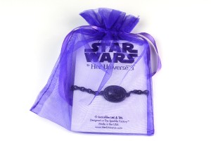 Each item came packaged inside a purple organza drawstring bag, with purple ribbon ties. Inside each bag is a white cardboard backing card with the Star Wars and Her Universe logos – but only the earrings are attached to the card, the necklace, bracelet and ring are loose and not attached to the card. This packaging is quite pretty if giving these as a gift – though I do wonder why the bracelet or necklace were not attached to the card, as they just sit at the bottom of the bag (I arranged them neatly for my photos instead). The Her Universe website notes all of the items in the Darth Vader jewelry collection are made from a base of white metal/steel that has been plated with an antique silver/dark hematite finish (Nickel Free, Hypoallergenic). The hematite finish of these items gives a much more interesting colour than flat black – they look almost obsidian or dark charcoal in colour in some light.