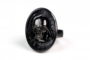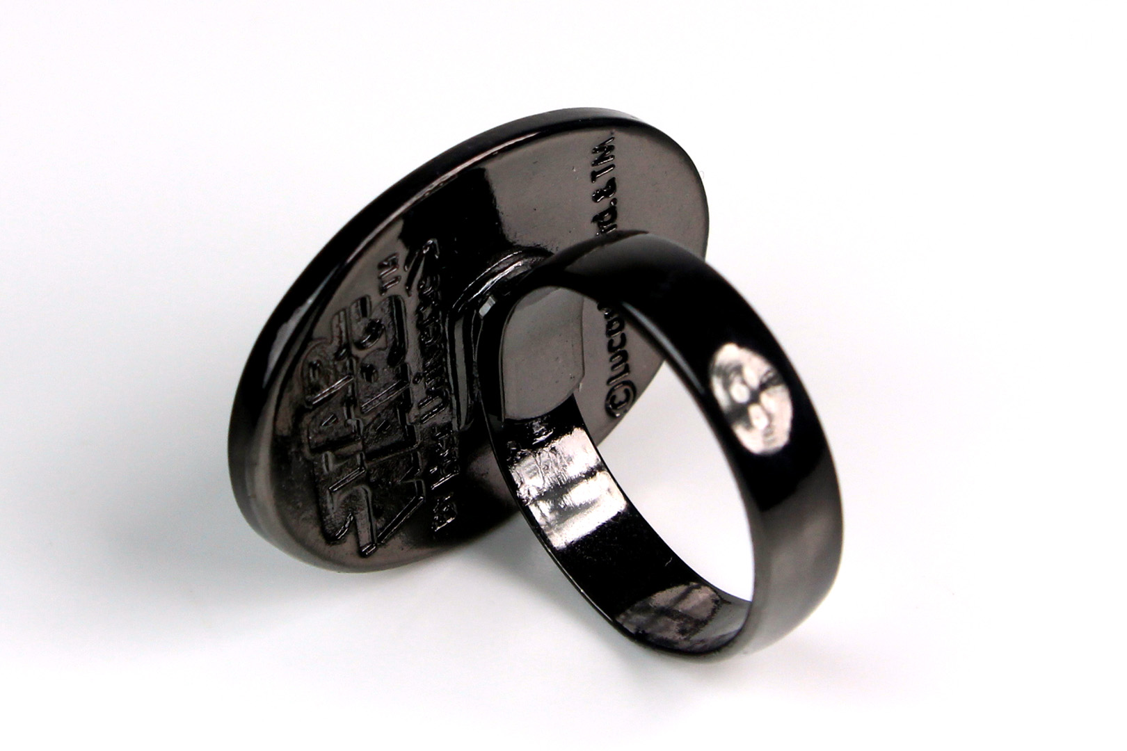 The Darth Vader mod ring features a 3D sculpt of Darth Vader’s helmet against an oval pendant setting. The ring has a glossy finish – the background of the oval around the helmet has a slight brushed finish that gives a nice contrast to the shine of the helmet. The back of the ring is stamped with the Star Wars logo, Her Universe logo, and the standard Lucasfilm copyright text. The main oval decoration part measures approximately 27mm by 20mm (and 8mm deep at the ‘highest’ part of the helmet sculpt). The band measures approximately 5mm wide – the approximate internal diameter of the band as it arrived is 18mm, but it can easily be tightened or widened with gentle force. The band is very sturdy – it overlaps underneath the main decoration, so it opens/adjusts on top of the finger, rather than underneath the finger when worn. It is very comfortable to wear – the large pendant makes this a statement ring, but it’s not heavy to wear.