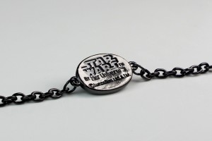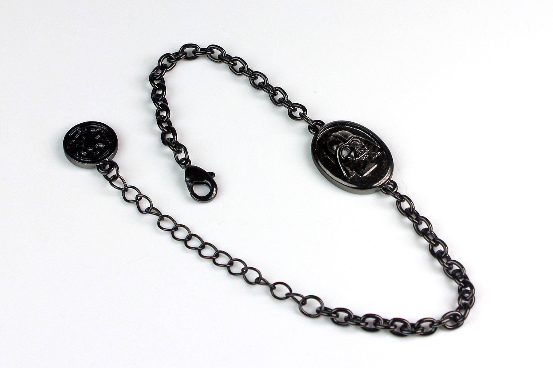 The Darth Vader pendant bracelet features the same size pendant as the necklace – though the bracelet’s pendant has slightly thicker borders on the oval setting (perhaps this is just due to small variations in manufacturing). The bracelet chain is attached to each end of the pendant – the section ‘above’ Darth Vader ends with a standard lobster claw style clasp, while the section ‘below’ Darth Vader has a length of adjusting chain (with wider chain links). The end of the adjustment chain features a small Imperial symbol pendant – a lovely added detail. The full bracelet measures approximately 19cm long, with a further 5cm for adjusting. Interestingly, this is 1cm longer than the Her Universe R2-D2 bracelet in the coordinating collection – also, the R2-D2 bracelet doesn’t feature any detail pendant at the end of the adjustment chain. The extra 1cm in length of the standard bracelet chain means this Darth Vader bracelet fits more loosely on my wrist than the R2-D2 version, so it moves around a little more on my wrist when wearing (even at the shortest length). Also the pendant at the end of the adjustment chain can knock against things when wearing (you can of course remove the end pendant if this bothers you).