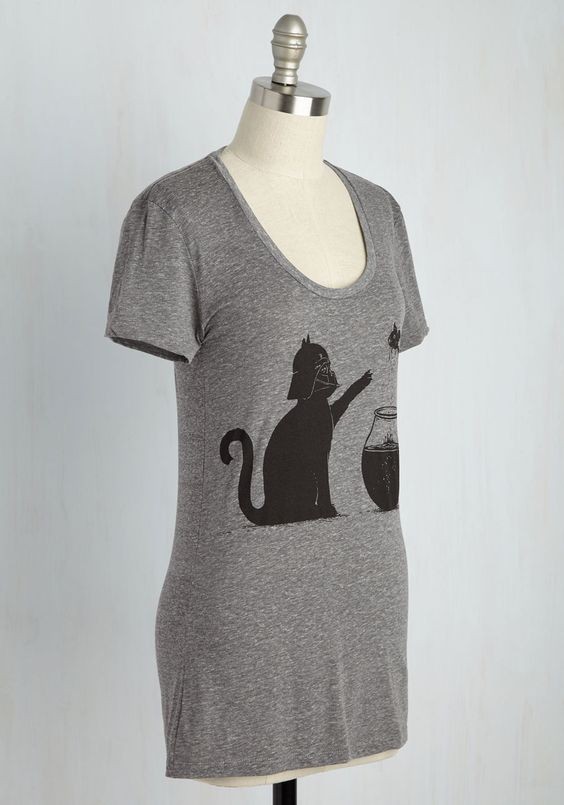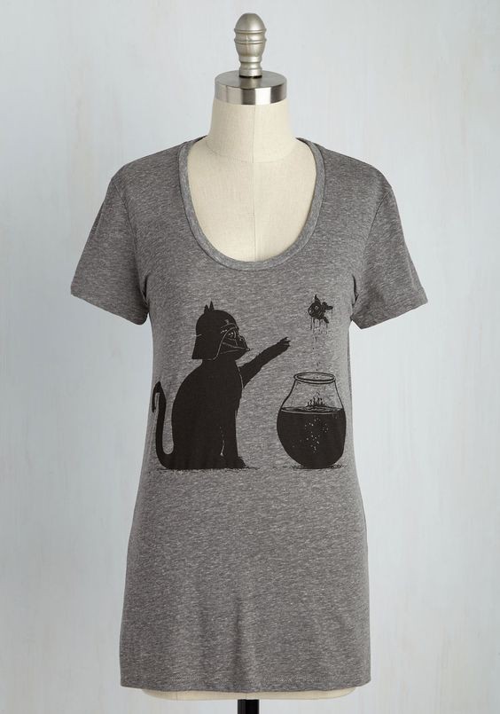 ModCloth has new women’s Star Wars t-shirt available. The women’s heather grey scoop neck t-shirt features a front print of a black cat wearing Darth Vader’s helmet, force-lifting a goldfish out of it’s bowl.