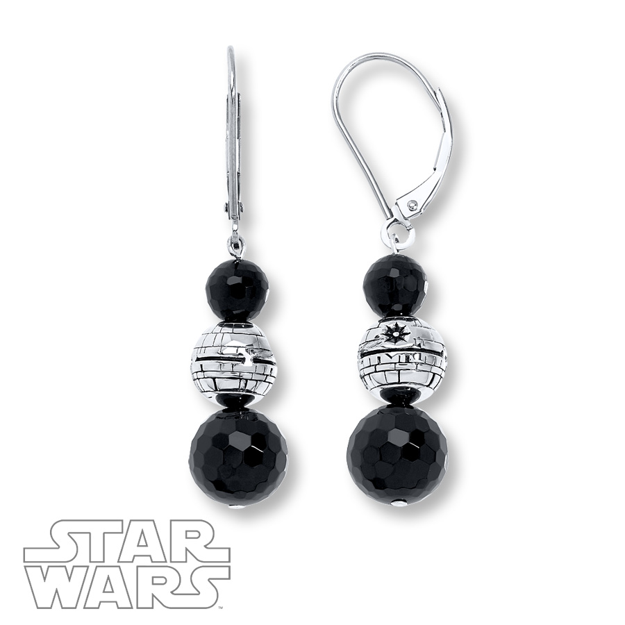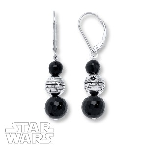 Kay Jewelers has a new pair of Star Wars earrings available. The sterling silver earrings feature a Death Star bead on each, set between two onyx beads and hang from Euro-wire backs. The earrings are priced at US$149.00 per pair – these coordinate well with the Darth Vader onyx bracelet or Death Star onyx bracelet also available. It appears that Kay Jewelers do not ship outside the US, but international fans can use the ‘personal shopper’ service available from mail forwarding companies to purchase from the website.