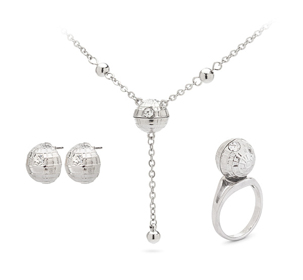 Thinkgeek has added a great new range of Death Star jewelry to their website. The range includes a necklace, ring and stud earrings, that match the earlier Death Star dangle earrings also available from Thinkgeek. Each piece features the Death Star with a rhinestone in place of the superlaser, a lovely touch of sparkle. The ring is available in sizes 6, 7 and 8, though the size 8 won’t be available for approximately 6-9 weeks. The stud earrings are priced at only US$14.99 a set, while the necklace and ring are priced at US$29.99 each – Thinkgeek can ship internationally.