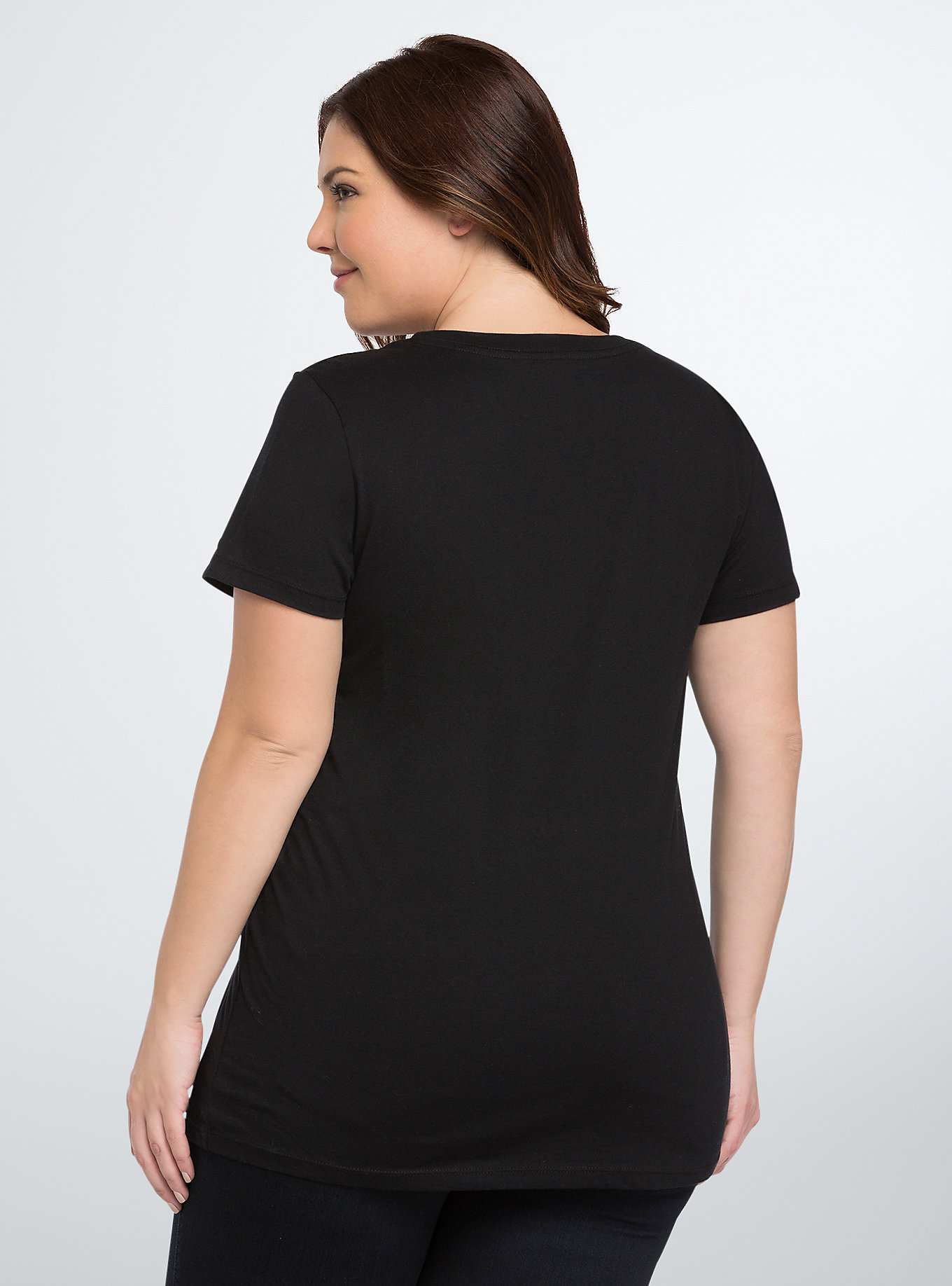 Torrid has a new women’s plus size Star Wars t-shirt available. The women’s black t-shirt features classic poster art for The Empire Strikes Back by artist Tom Jung. Available in plus sizes 0 to 6, the t-shirt is priced at US$34.50 each – but is currently included in Torrid’s online promotion of ‘buy 1 get 1 50% off’ (discount applied at checkout). Torrid can ship internationally, which is great.