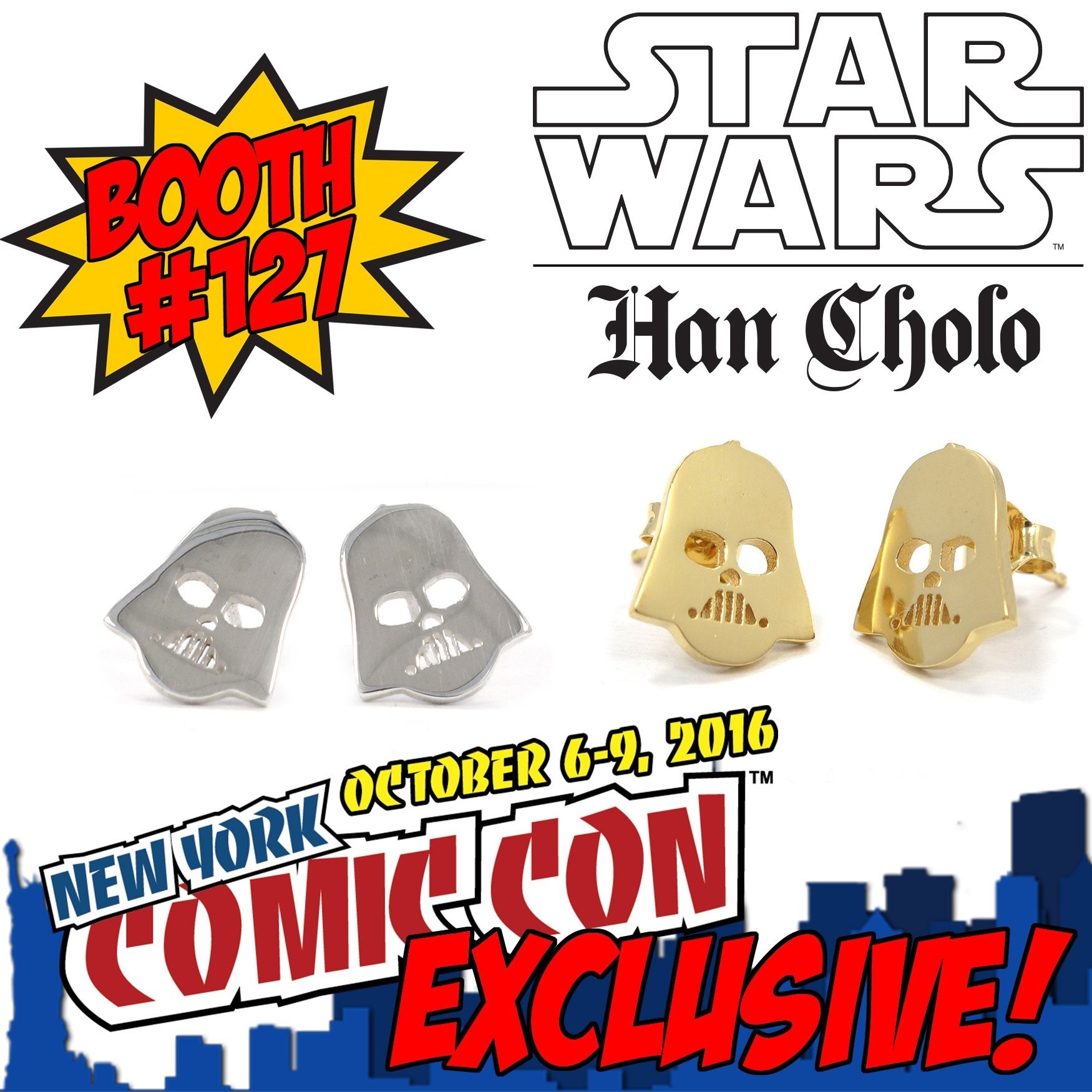 New York Comic Con is coming up this weekend, and Han Cholo will have exclusive Star Wars jewelry available at the event! At the Han Cholo booth #127, they will be selling the fantastic Darth Vader stud earrings, available in gold or silver tone finish. I own the Yoda stud earrings and Lightsaber stud earrings, and I absolutely love them – they have proper ‘butterfly’ style backings, which are nice and secure for wearing all day.