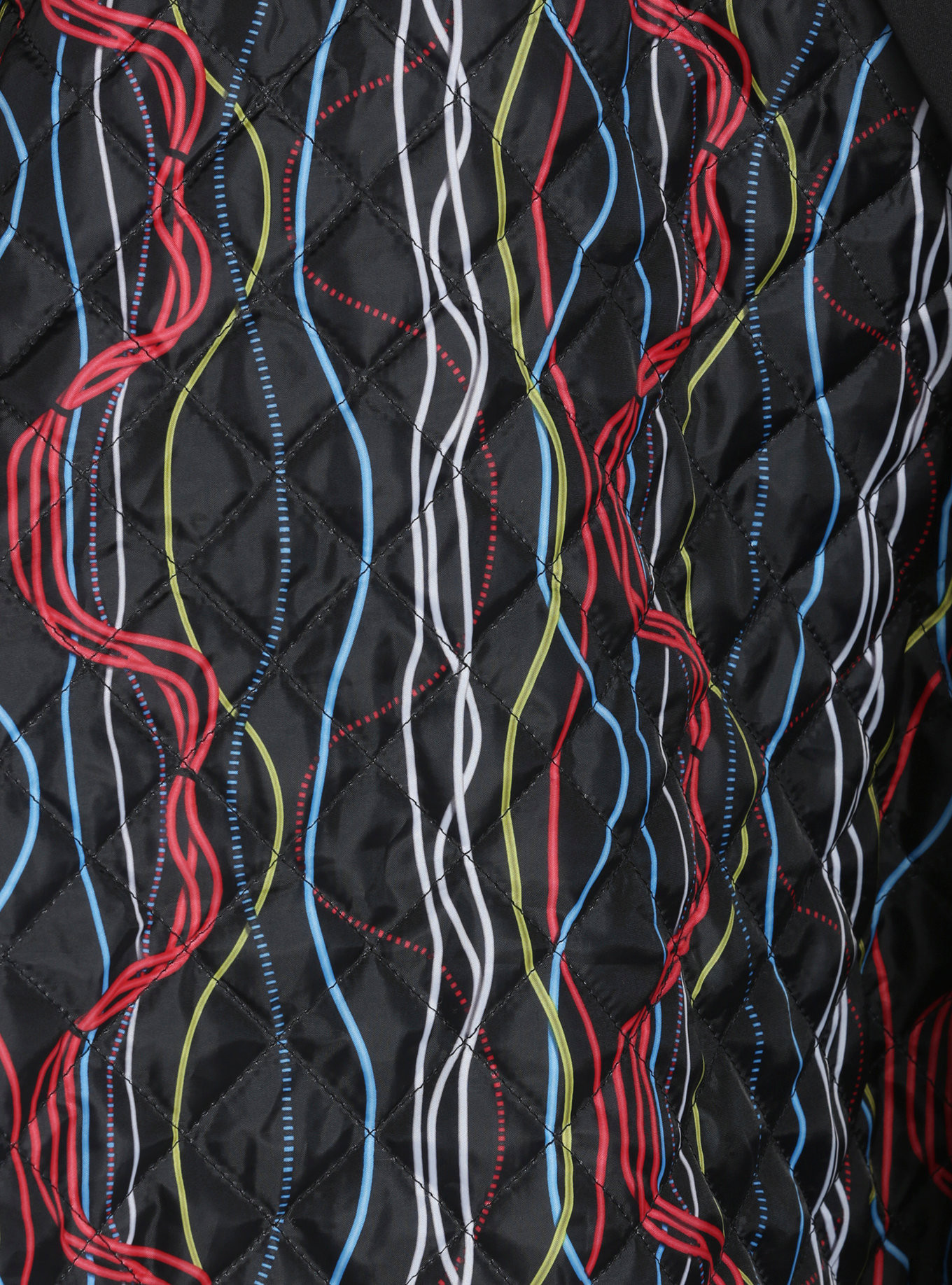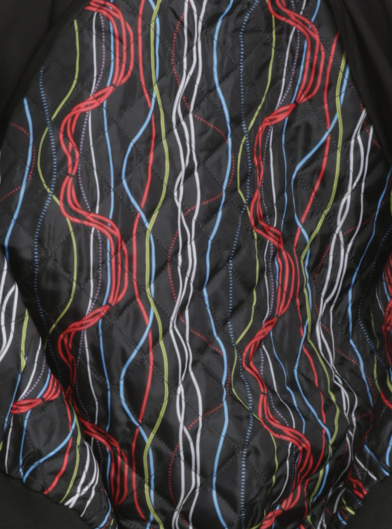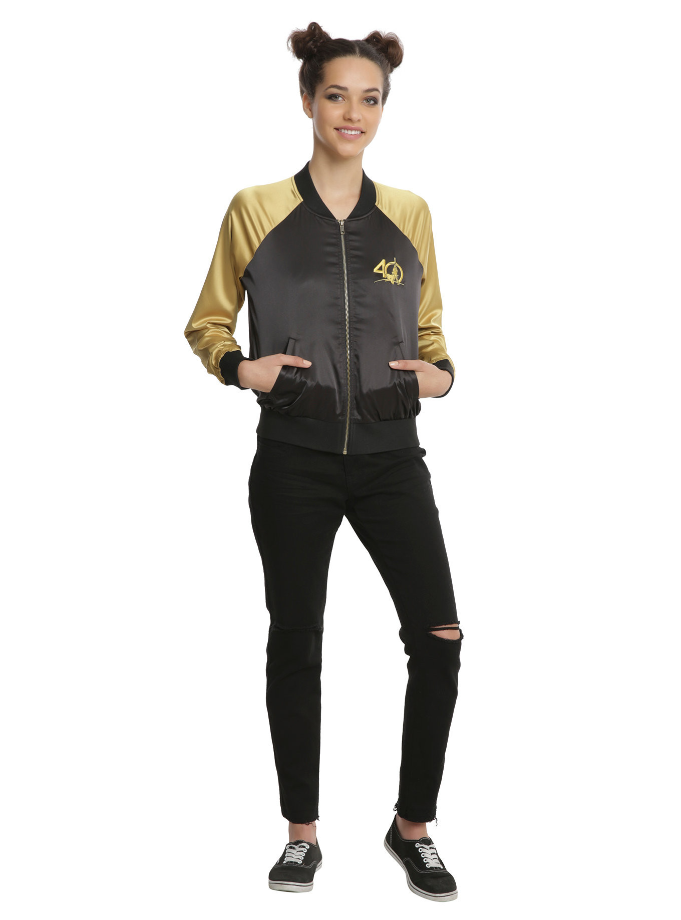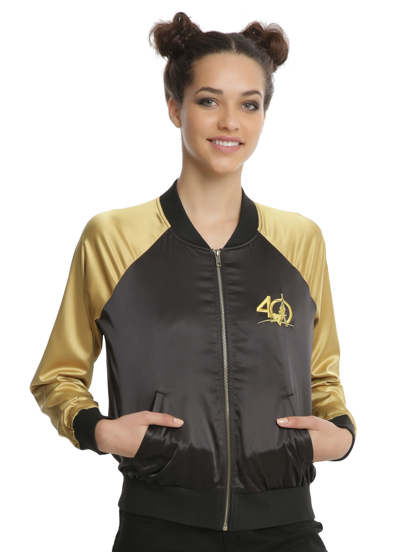 Work on your human-cyborg relations (or deliver stolen rebel plans) in this gold and black satin Star Wars souvenir jacket. R2-D2 and C-3PO are embroidered on the Tatooine-inspired background. Printed on the interior lining is a wire graphic to make any droid feel at home.