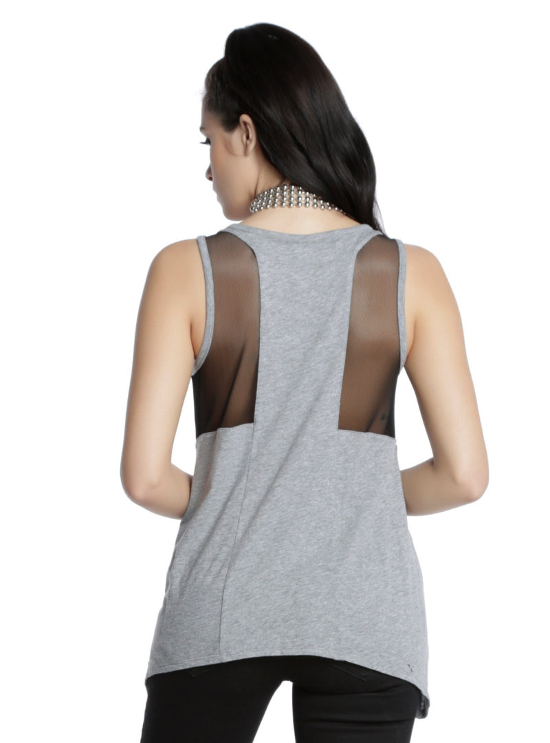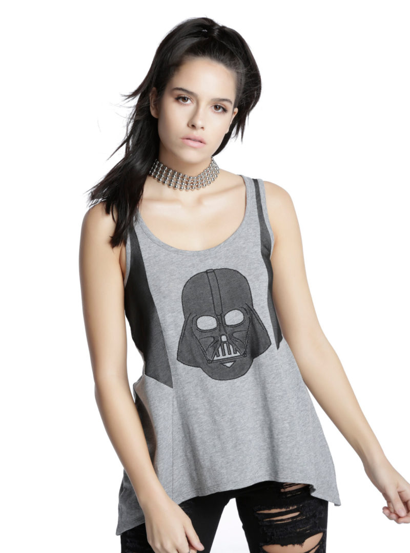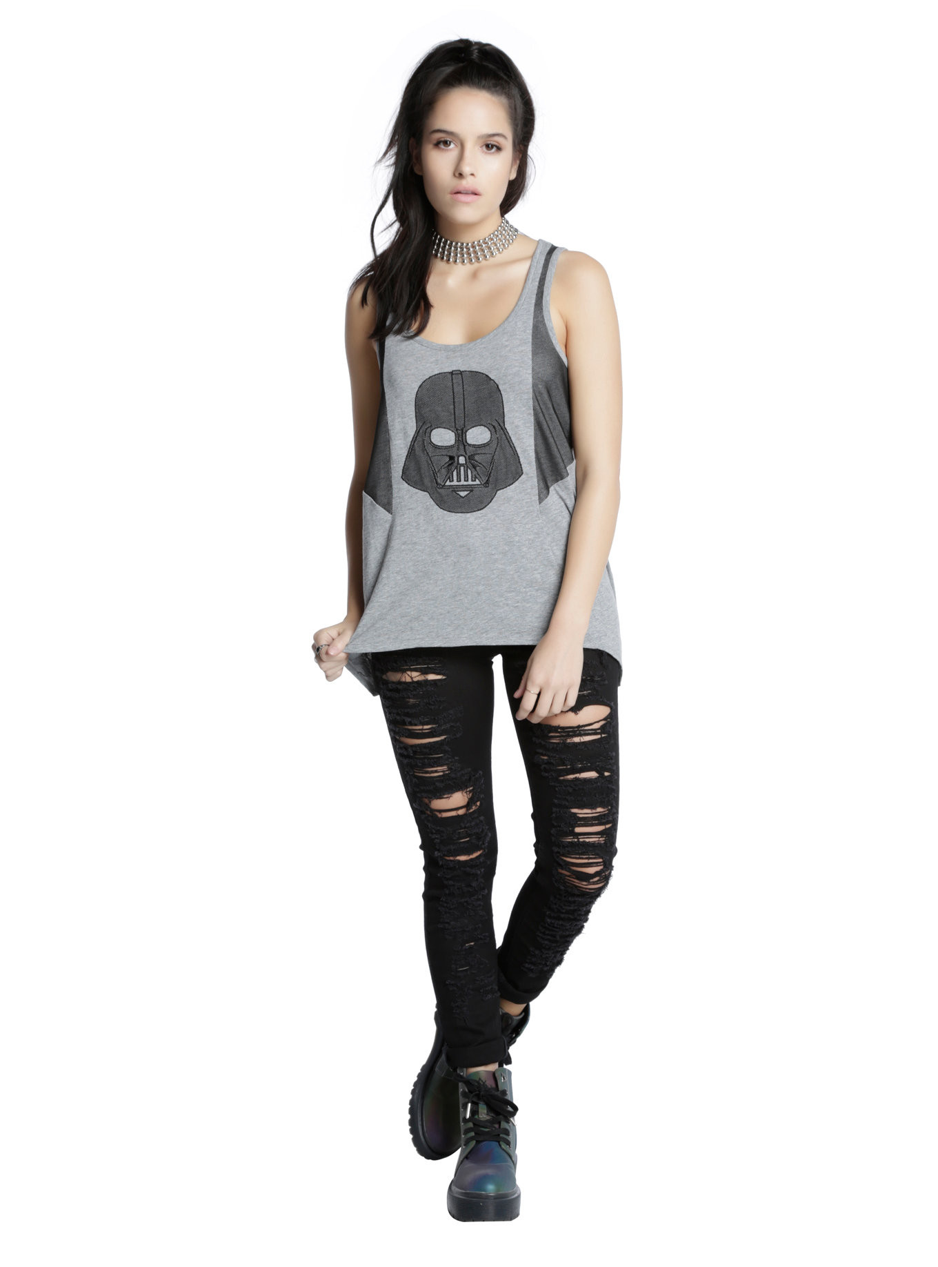 If you’ve found your lack of cute tank tops disturbing, be disturbed no longer. This grey tank not only has rad Darth Vader mesh embroidery on the front, it has a fun and flirty shark-bite hem and matching mesh panels.