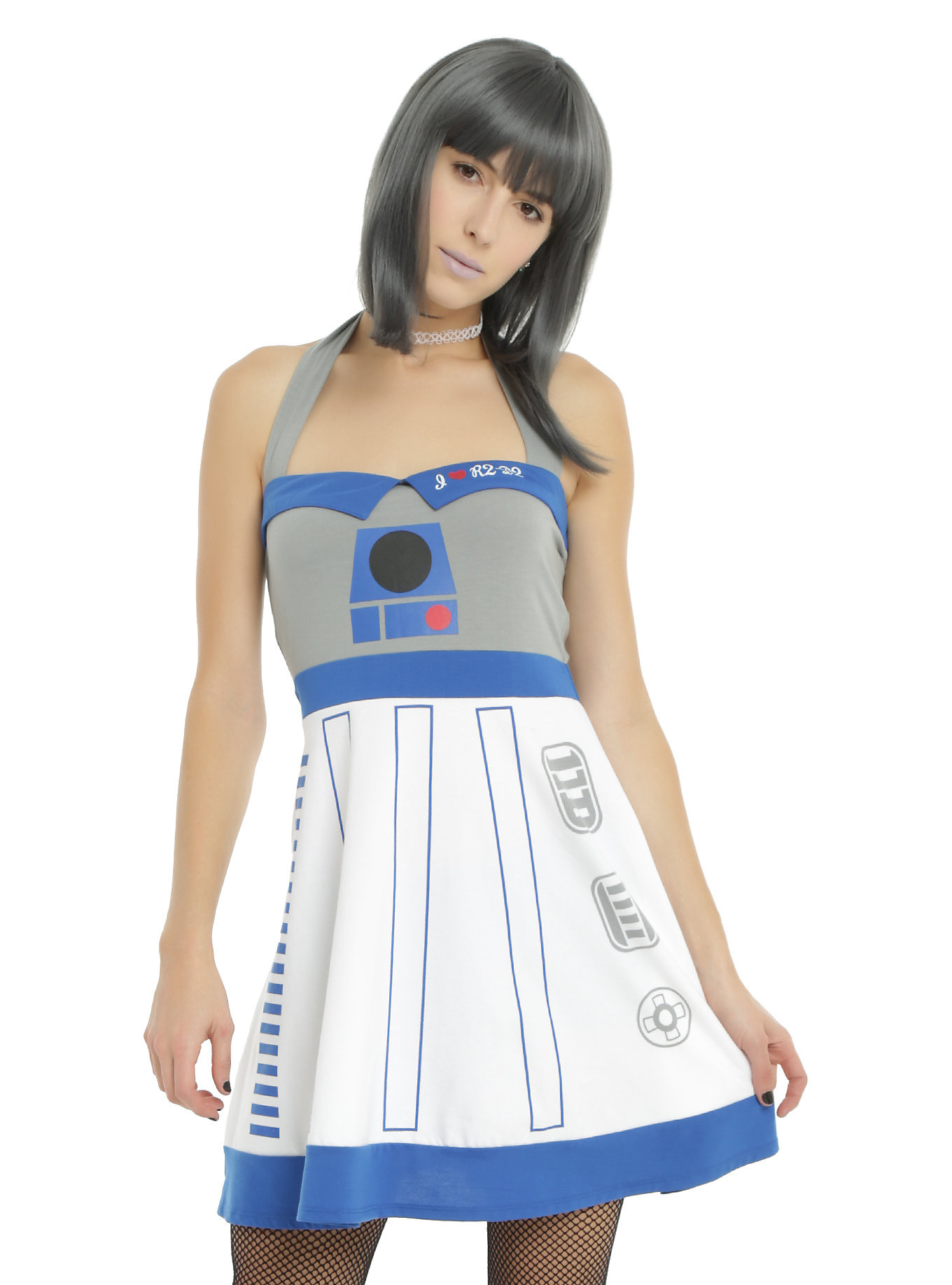 Be the droid everyone will be looking for in this R2-D2 dress from Star Wars and Her Universe. The fit and flare dress has a grey bodice that features an Artoo graphic on front and a fold-over cobalt blue collar with “I (Heart) R2-D2” text design and grey adjustable halter straps. A fitted cobalt waistband leads to a white flared skirt with cobalt blue hem and R2-D2 graphics.