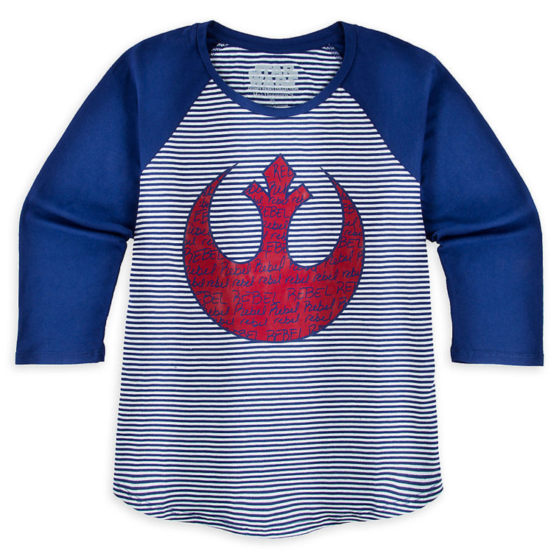 This new Her Universe x Star Wars Rebel Alliance tee is available from the Disney Store. The striped t-shirt features blue 3/4 length raglan style sleeves, and a front print of the Rebel Alliance ‘starbird’ symbol in red, filled with blue ‘Rebel’ handwriting style text. This is labelled as being part of the Disney Parks Collection, so this tee is mostly likely available at the US Disney Parks as well.
