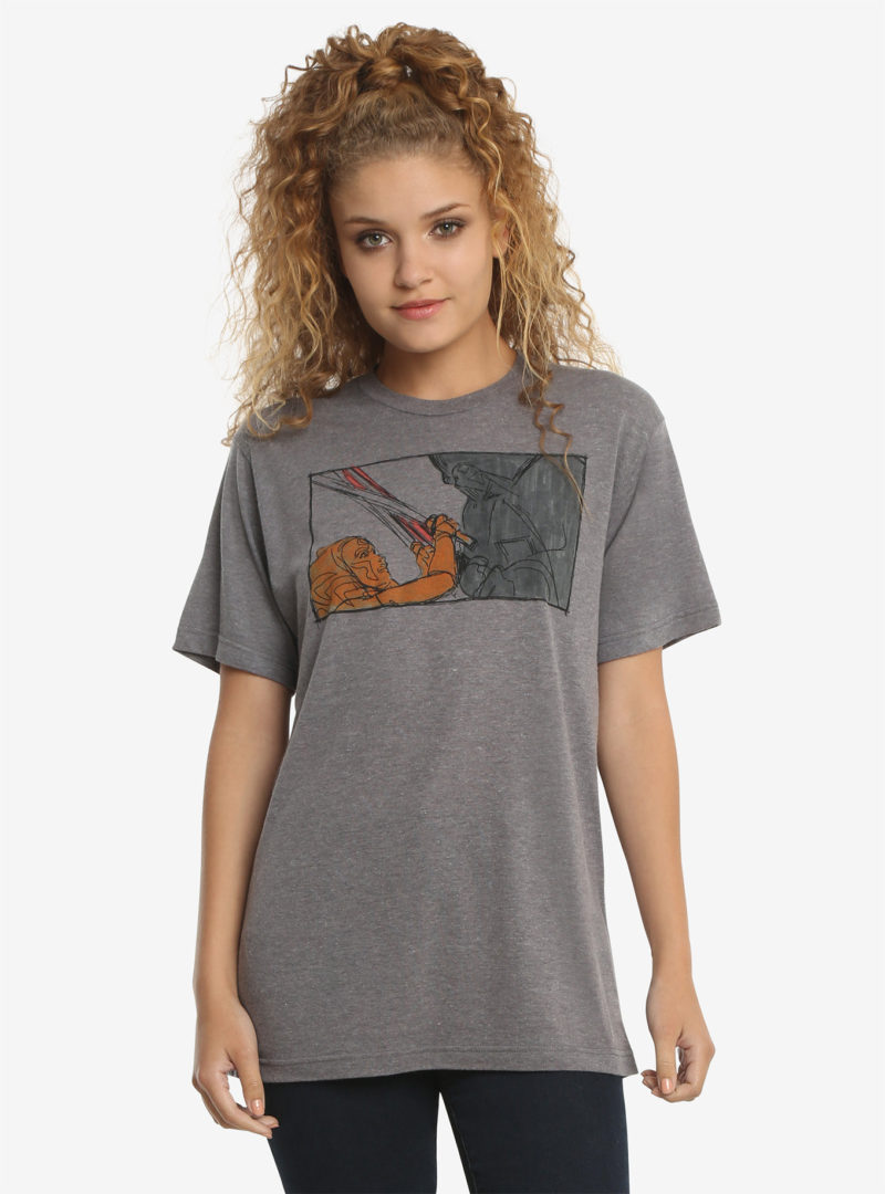Darth Vader was shocked to find Ahsoka Tano alive, but knew that Ahsoka would seek to avenge her master, Anakin Skywalker, by battling him in Star Wars Rebels. This grey unisex tee immortalizes their fierce battle in the Sith Temple with a front screen featuring storyboard art from the Season 2 finale by Dave Filoni!