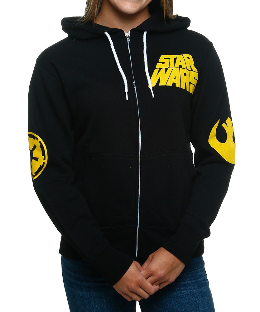 Shirts.com has added several new women’s Star Wars apparel items, including a hooded sweatshirt and tank tops. The black hooded sweatshirt features yellow Imperial and Rebel Alliance logos on the sleeves, and the Star Wars logo on the front and back. The range of newly added designs include the Death Star, Boba Fett, R2-D2, vintage comic art, and artwork by Drew Struzan. Interestingly, the long sleeve ‘Le Death Star’ t-shirt was previously available (in a different colour) exclusively from Thinkgeek, so here’s a second chance if you missed out earlier. Shirts.com also have several items from the We Love Fine x Goldie collection, including the popular R2-D2 sweater and Chewbacca jacket. All the new items are available in sizes S to XL, with some also available in XS and 2XL. Prices vary from US$14.99 to US$42.99 – Shirts.com can ship internationally.