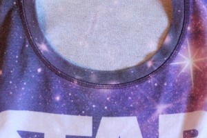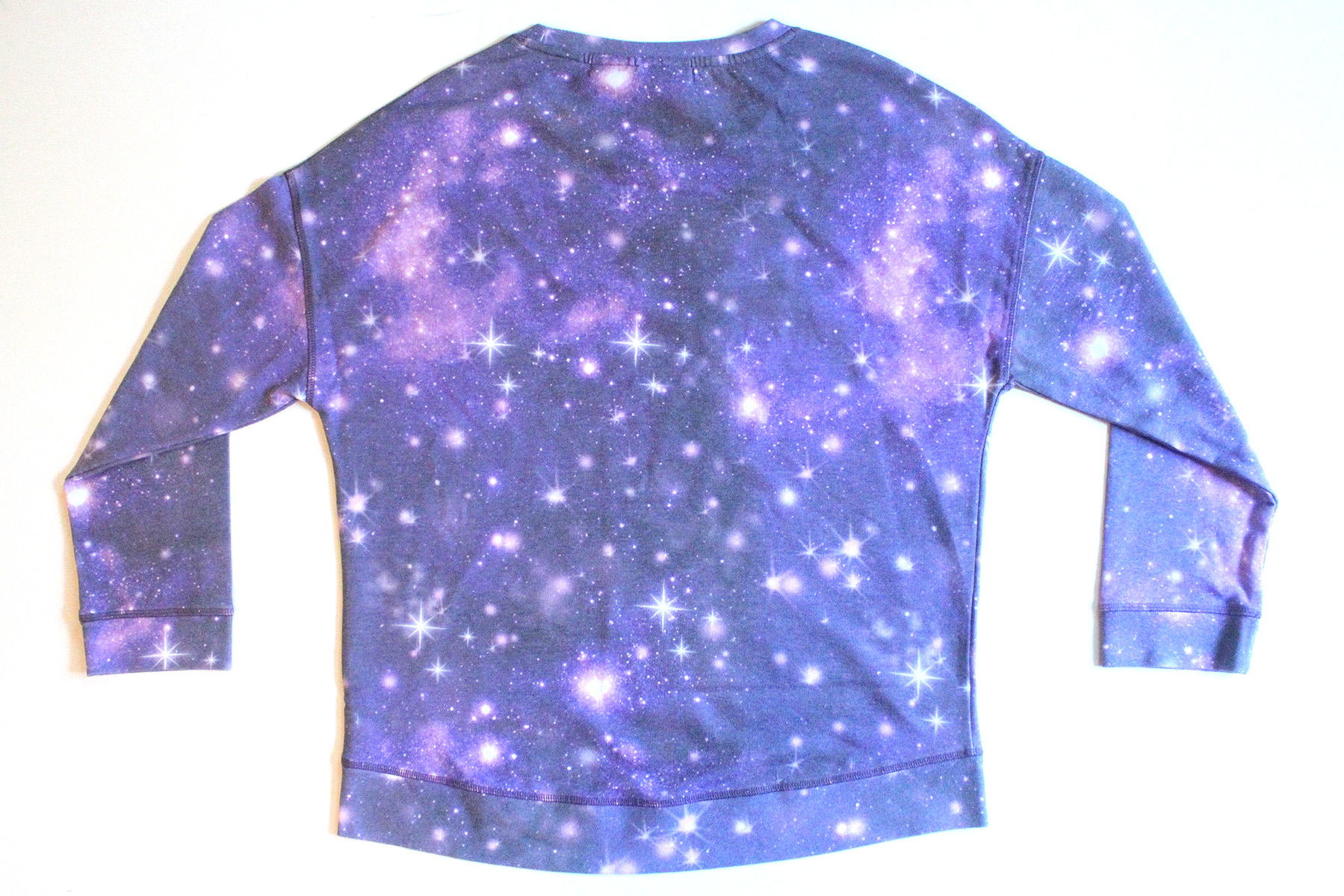 The girl’s Star Wars crew top is sewn from a purple and pink starry sky printed fabric, with a white Star Wars logo as part of the print on the front. The garment tag notes the fabric is 62% polyester, 38% cotton – a nice lightweight material, but not the usual sweatshirt type fabric. The photos on the website showed the sleeves rolled up in a cuff style – but they are not sewn like that, as you can see in my photos. This size 14 top measures approximately 56cm across the chest (underarm to underarm), 54cm from front neckline to hem, while the sleeves measure 44cm from shoulder seam to sleeve end. While I expected the sleeves to be a little on the shorter side (being a children’s item), they’re not too bad for my height – but I wasn’t expecting such a large measurement across the chest. As this size 14 isn’t the largest size available, this top could easily work for some women as well – in a rolled up sleeves/casual style if you’re taller/have longer arms. I was drawn to it for it’s colour, I love the purple print – it’s not too bright or overwhelming, which works well for adults.