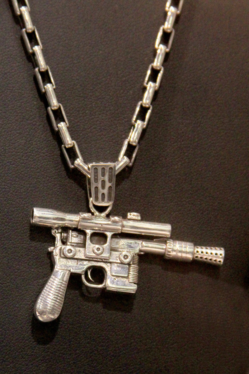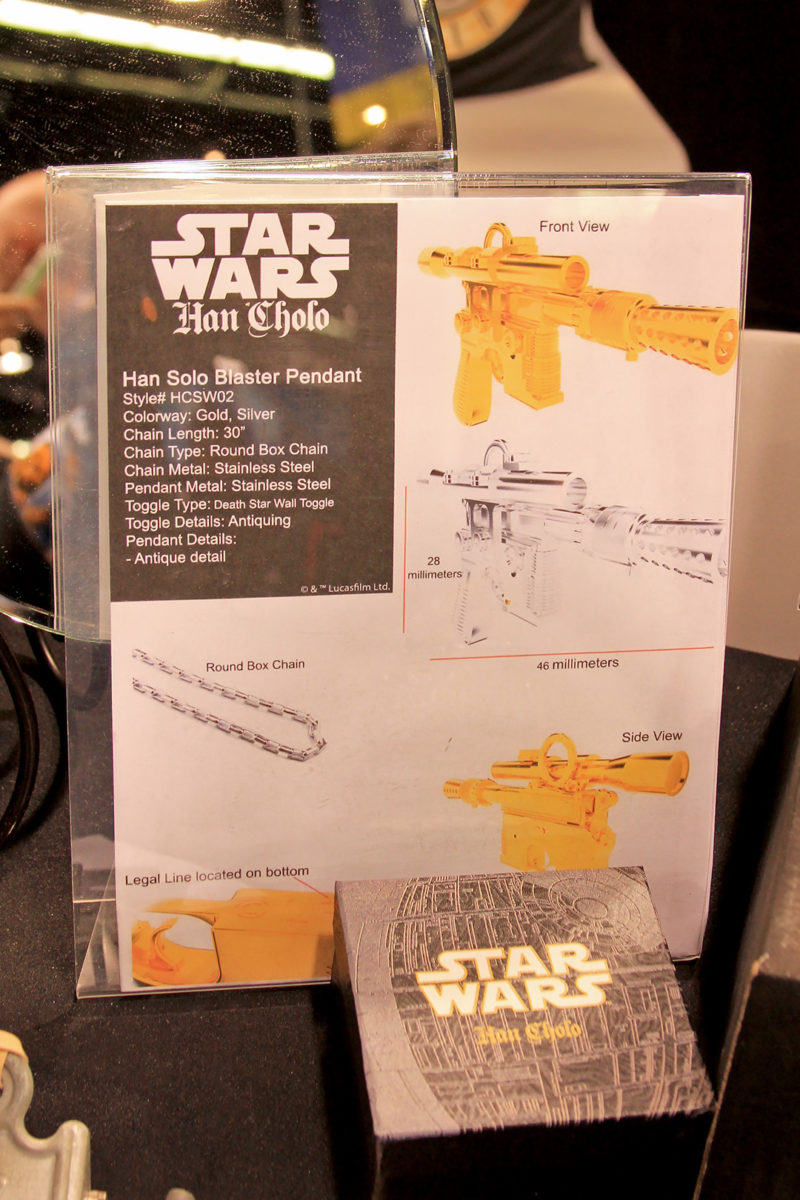 This first collection is available now, with the two blaster pendants available for preorder. They are made in sterling silver – prices range from approximately US$300 up to $1000 (for larger items like a Han Solo blaster belt buckle). While currently only available to buy at Celebration Anaheim, this collection will be available on-line on May 4th. The figure pendants are approximately in the 1″ to 2″ size range, great for fine detail. A ‘second tier’ collection is set to be released around Christmas, with stainless steel versions of the items – the prices will range from approximately US$70 to US$100.
