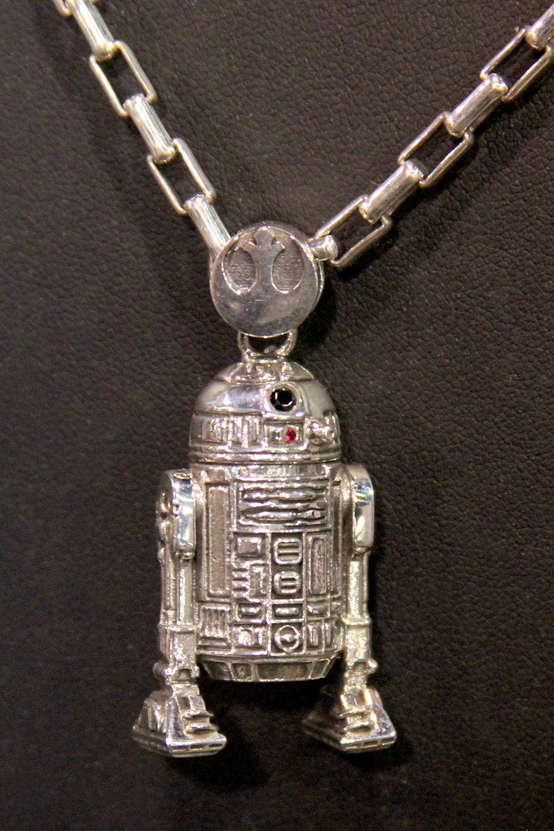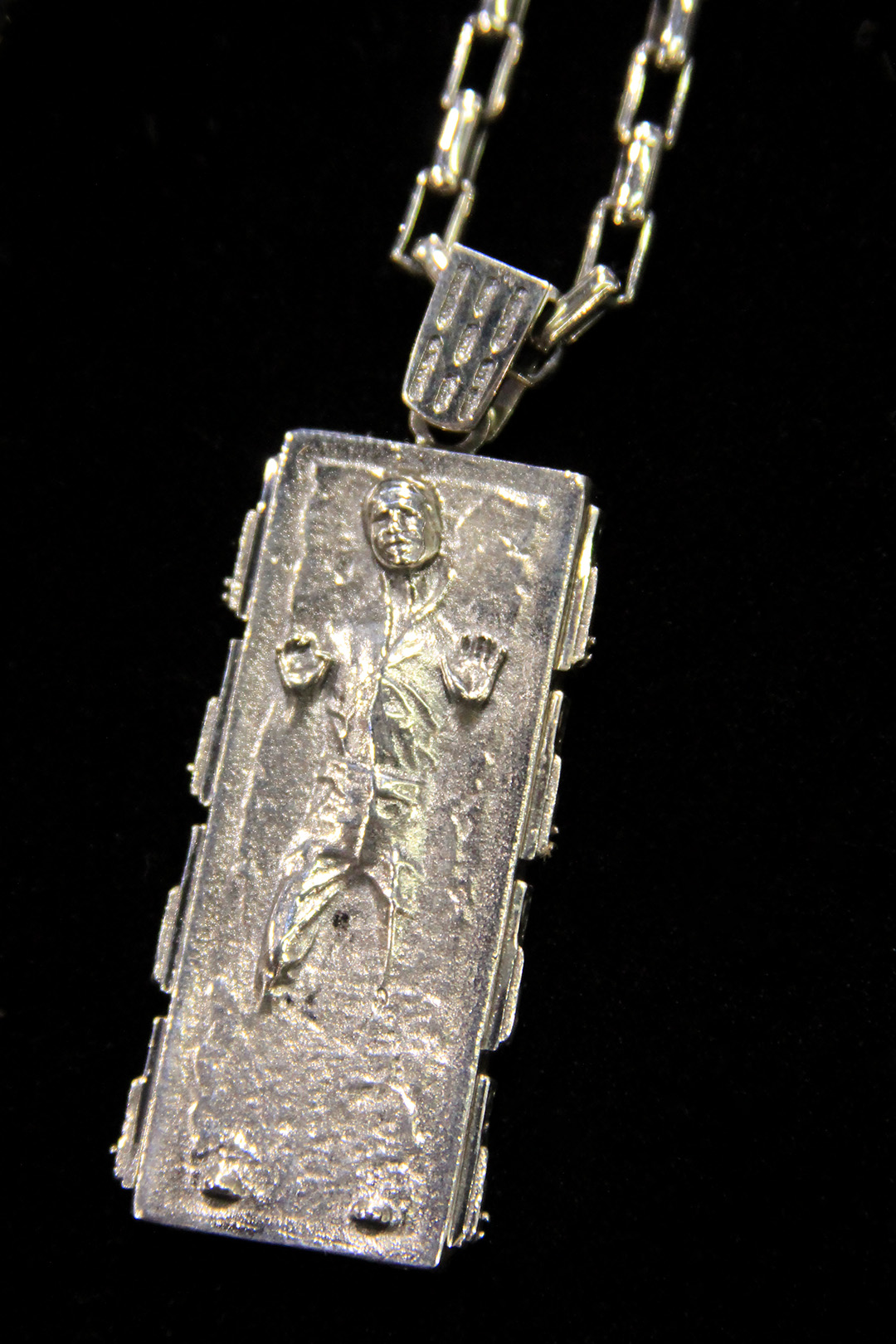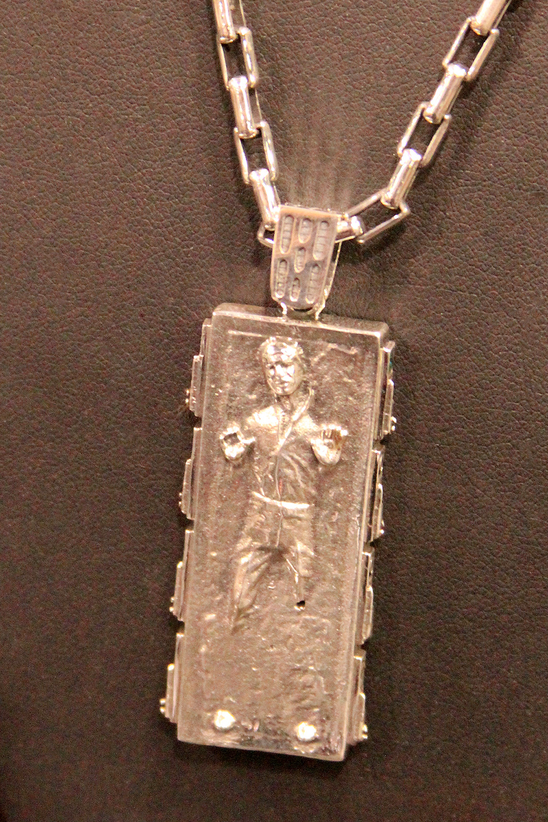 These pieces are amazing in person – I love the details like R2-D2’s lights (cubic zirconia stones) and Darth Vader’s lightsaber is 14k gold plated. The pendant hangers are another fantastic aspect, with the stormtrooper and Darth Vader pendants hanging from an Imperial logo, the R2-D2 pendant hanging from a Rebel Alliance logo, and the Han in Carbonite and Han Solo blaster pendant hangers using the characteristic Death Star wall light panel design.