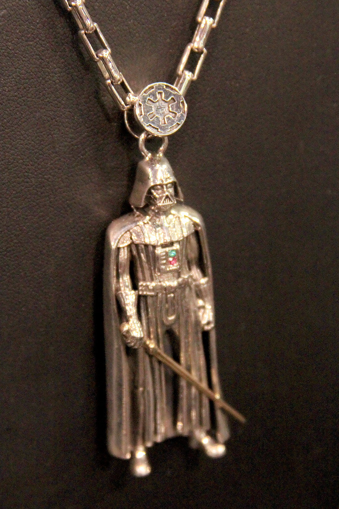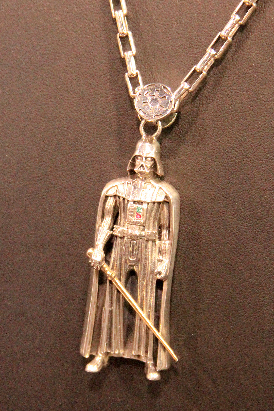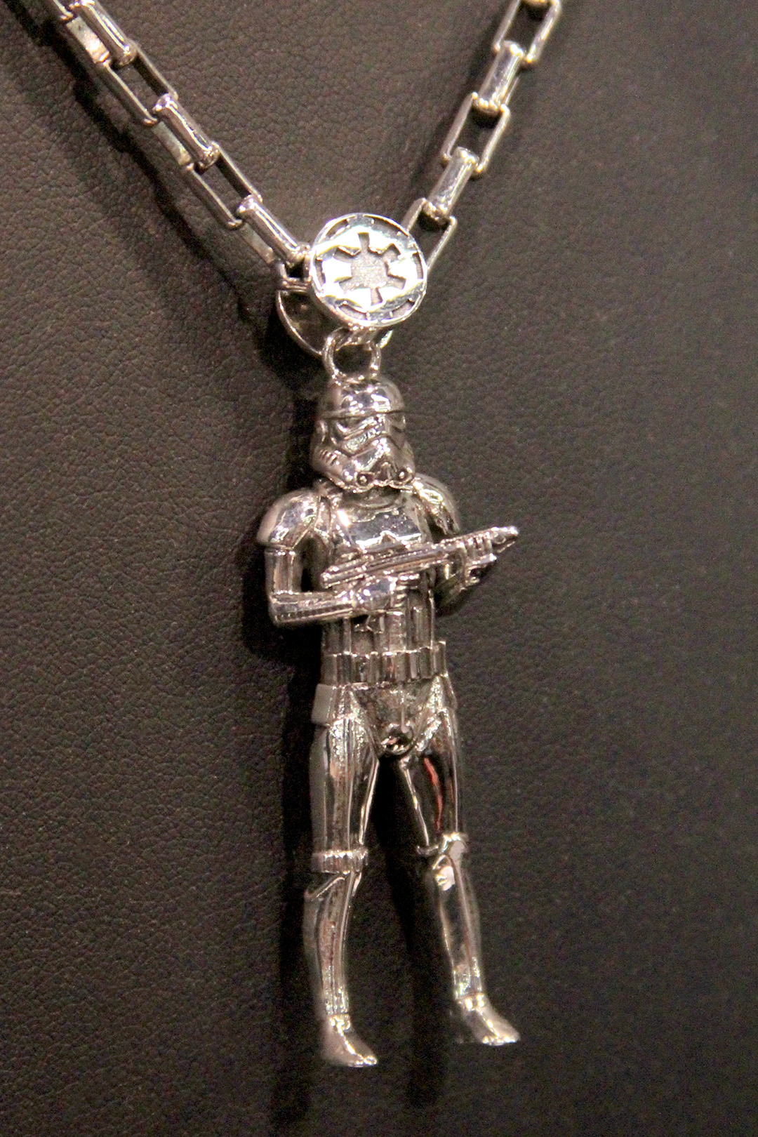 These pieces are amazing in person – I love the details like R2-D2’s lights (cubic zirconia stones) and Darth Vader’s lightsaber is 14k gold plated. The pendant hangers are another fantastic aspect, with the stormtrooper and Darth Vader pendants hanging from an Imperial logo, the R2-D2 pendant hanging from a Rebel Alliance logo, and the Han in Carbonite and Han Solo blaster pendant hangers using the characteristic Death Star wall light panel design.
