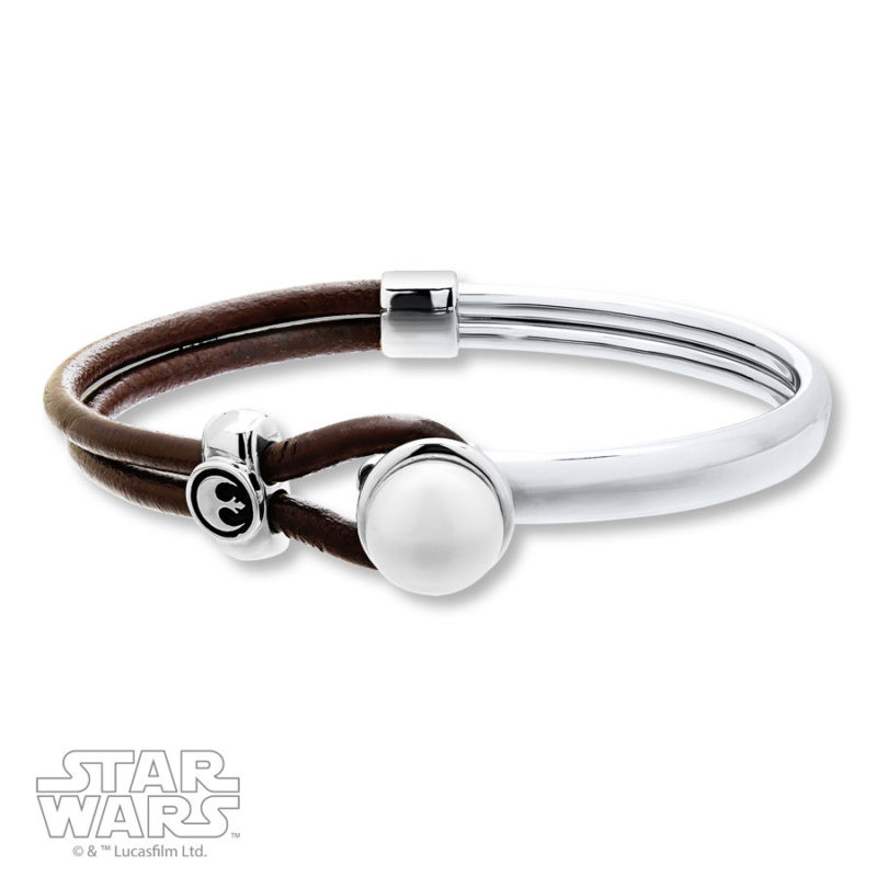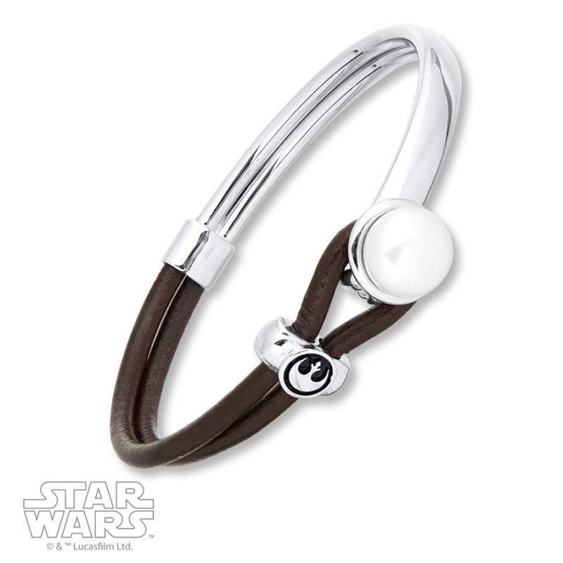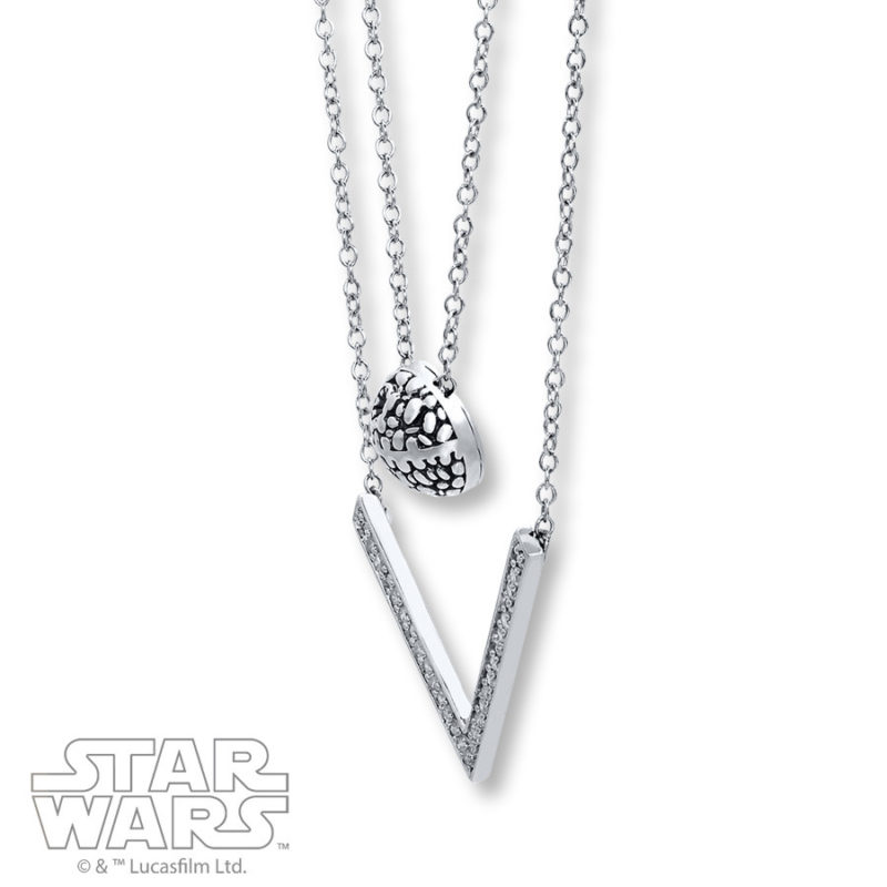 There is also a new bracelet design, featuring the Rebel Alliance symbol on a leather strap that loops around a button made from Pearl. Lastly, there is a Death Star double necklace – the flat-backed Death Star necklace hangs on the first chain, while the second longer chain features a ‘V’ set with 1/10th Carat total weight of Diamonds.