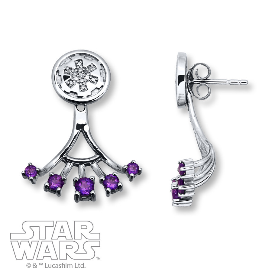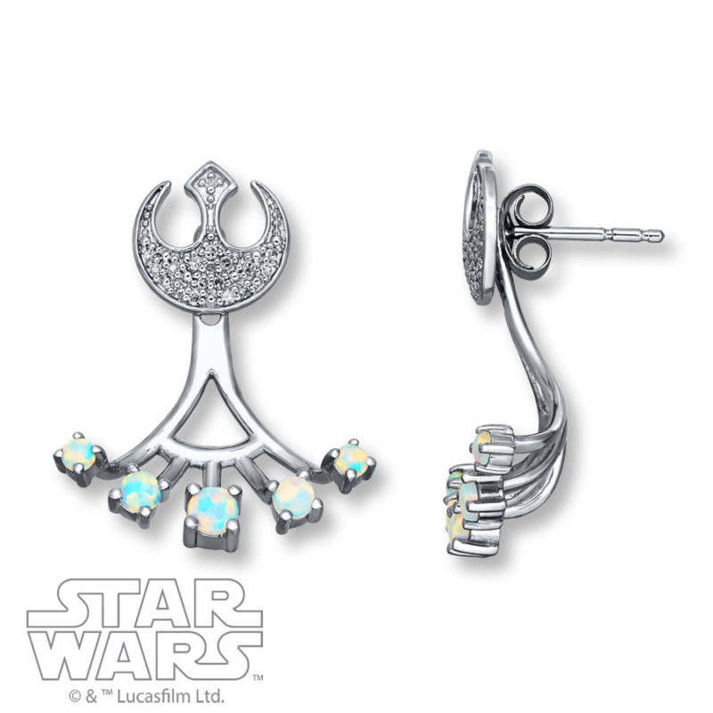 Kay Jewelers has added a few more new designs to their Star Wars jewelry range. There are some gorgeous new earring designs – the first pair features the Rebel Alliance ‘starbird’ symbol accented with Diamonds and additional Opal stones hanging below, while the second pair features the Galactic Empire ‘cog’ symbol accented with Diamonds and additional Amethyst stones hanging below. The additional hanging stones are attached so that they hang behind the earlobe, with the stones appearing just below your ear – a very neat design.