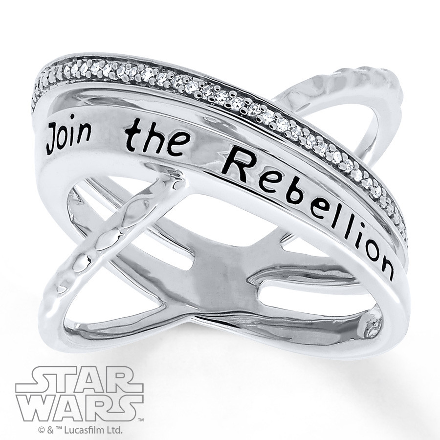 This stellar Star Wars™ ring features criss-cross bands of sterling silver, one featuring the words “Join the rebellion.” Diamond accents complete the look. © & ™ Lucasfilm Ltd.