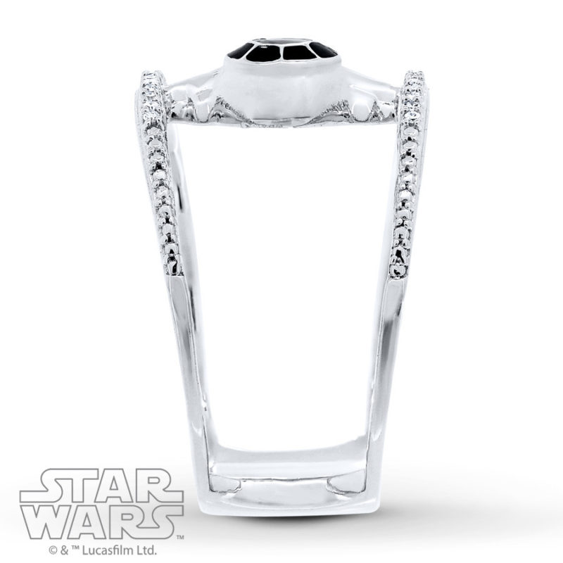 This striking Star Wars™ ring features a TIE fighter design styled in sterling silver with diamond accents. Black enamel completes the look. © & ™ Lucasfilm Ltd.