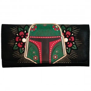 Modern PinUp has added two new Loungefly x Star Wars items to their website. The new coordinating crossbody bag and wallet both feature a ‘sugar skull’ style Boba Fett design, with applique’ and embroidery details similar to earlier stormtrooper and Darth Vader ‘sugar skull’ items in the range (I reviewed the stormtrooper wallet here). The crossbody bag is priced at US$59.00, the wallet is priced at US$35.00 – or buy both as a bundle for US$92.00 (saving US$2). Modern PinUp offers free US shipping on all orders, and free international shipping on orders over US$100, which is great!