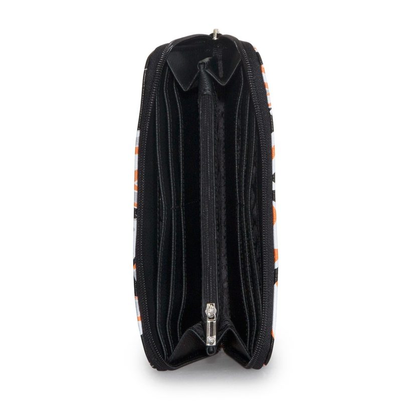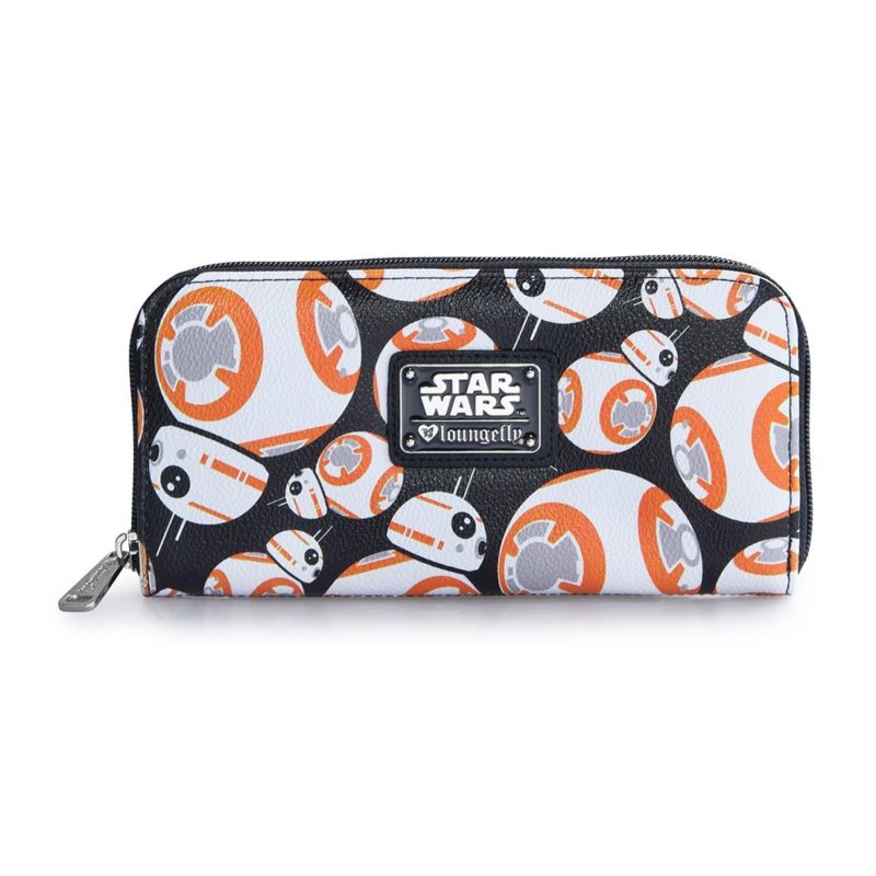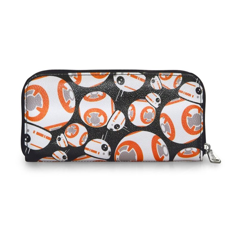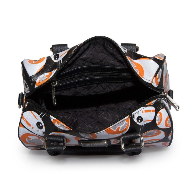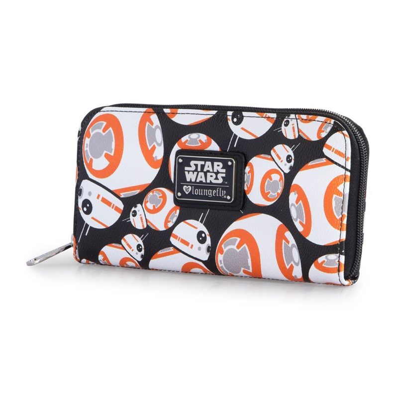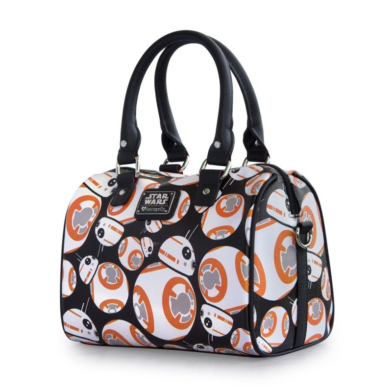 Loungefly has a new women’s BB-8 handbag and matching wallet available! First previewed at the WWDMagic trade show back in February, it’s great to see this set arrive at Loungefly.com. The duffle style handbag features an all-over repeating print of BB-8 against a black background, removable adjustable shoulder strap, and internal zip pocket. The zip up wallet also features the same all-over repeating print – both items feature the classic Loungefly x Star Wars details like the black Star Wars logo printed linining fabric, and metal logo plaque.