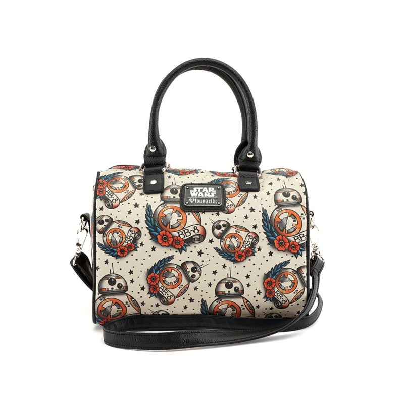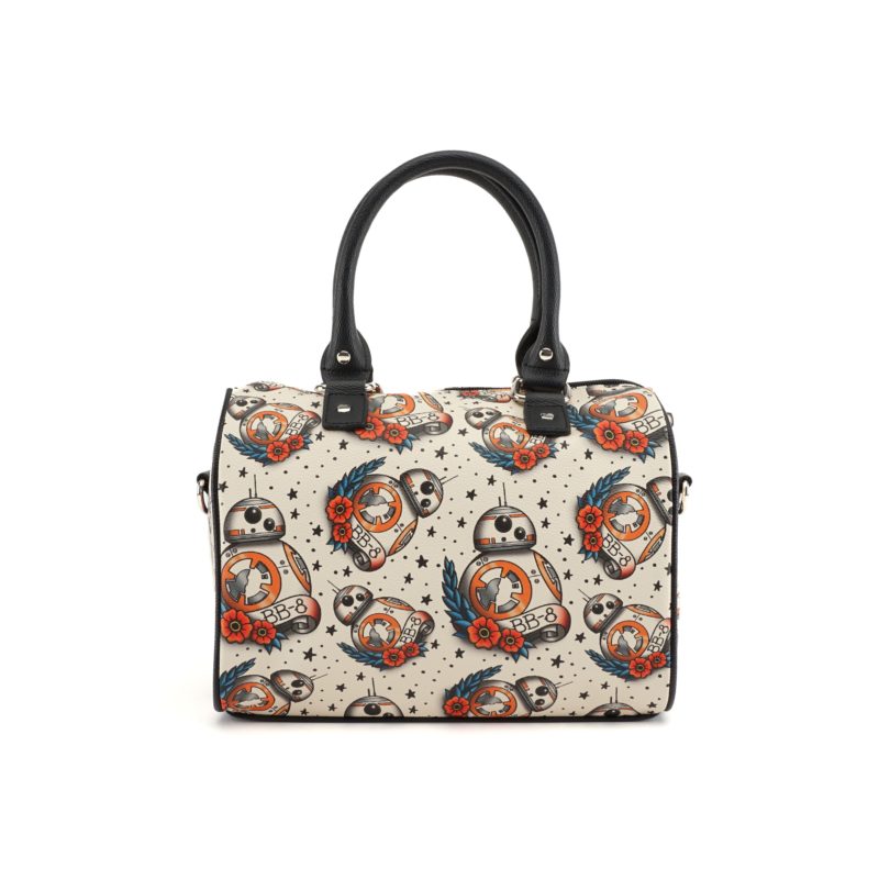This new Star Wars The Force Awakens BB-8 tattoo flash print handbag is now available at Loungefly. The faux leather handbag has a duffle style shape, and features a fun tattoo style all-over print of BB-8. The bag has black top handles, and a removeable black faux leather shoulder strap.