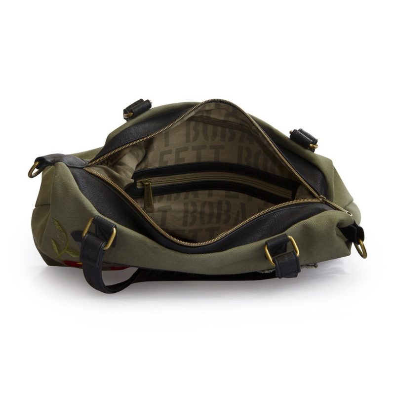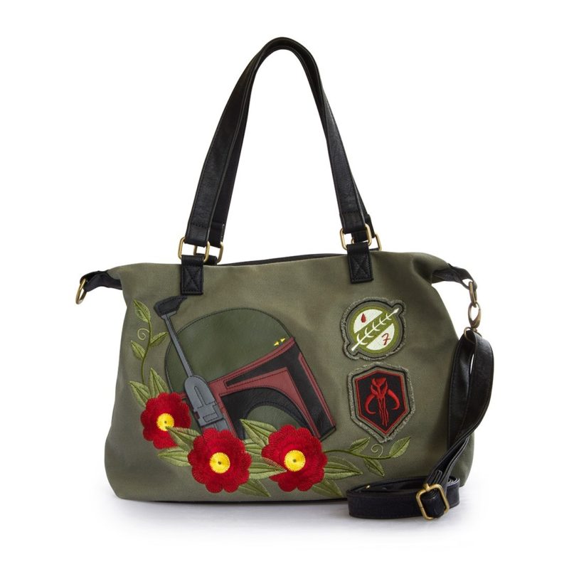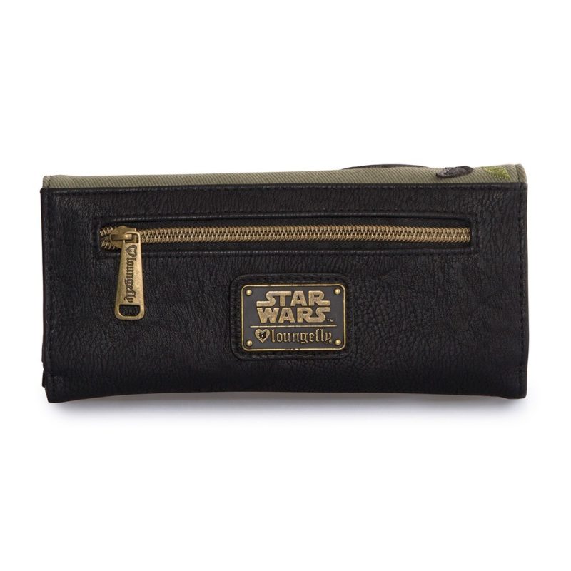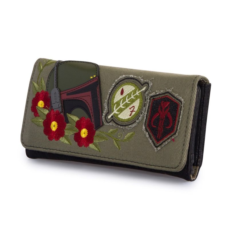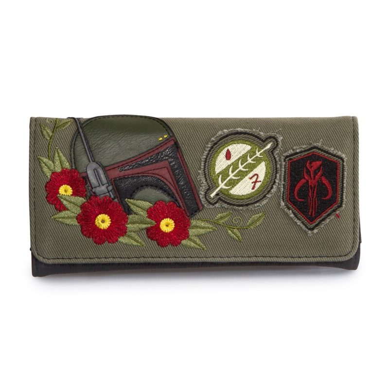 Loungefly has two new Star Wars items available – the Boba Fett twill crossbody bag and matching wallet! These were first previewed at the WWD Magic trade show back in February, so it’s great to see this new style finally become available. Both items are made from a green twill, and feature a large faux leather applique of Boba Fett’s helmet, with floral embroidery, with two Mandalorian symbol patches. The lining of both items is different from the usual black Star Wars logo printed lining fabric usually seen in Loungefly x Star Wars items – the lining for these items features the text ‘Boba Fett’ in a stencil-style repeating print. While I’m not usually a huge Boba Fett fan, I am absolutely loving this new bag style!