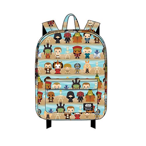 Get the latest fashion from a galaxy far, far away. This Star Wars Phantom Menace Chibi Character Print Backpack is made of nylon, with printed details. It measures approximately 11 1/2-inches x 17 1/2-inches x 5-inches.