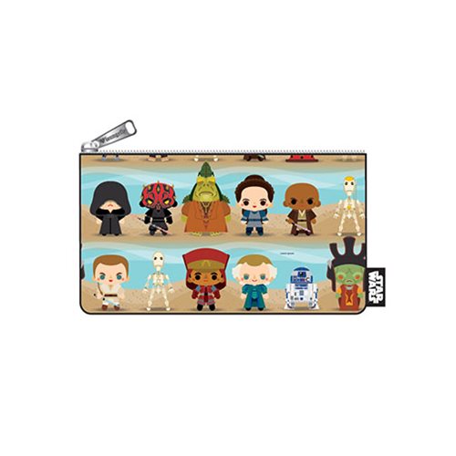 Get the latest fashion from a galaxy far, far away. This Star Wars Phantom Menace Chibi Character Print Pencil Case is made of nylon, with printed details. It measures approximately 8-inches x 4-inches.