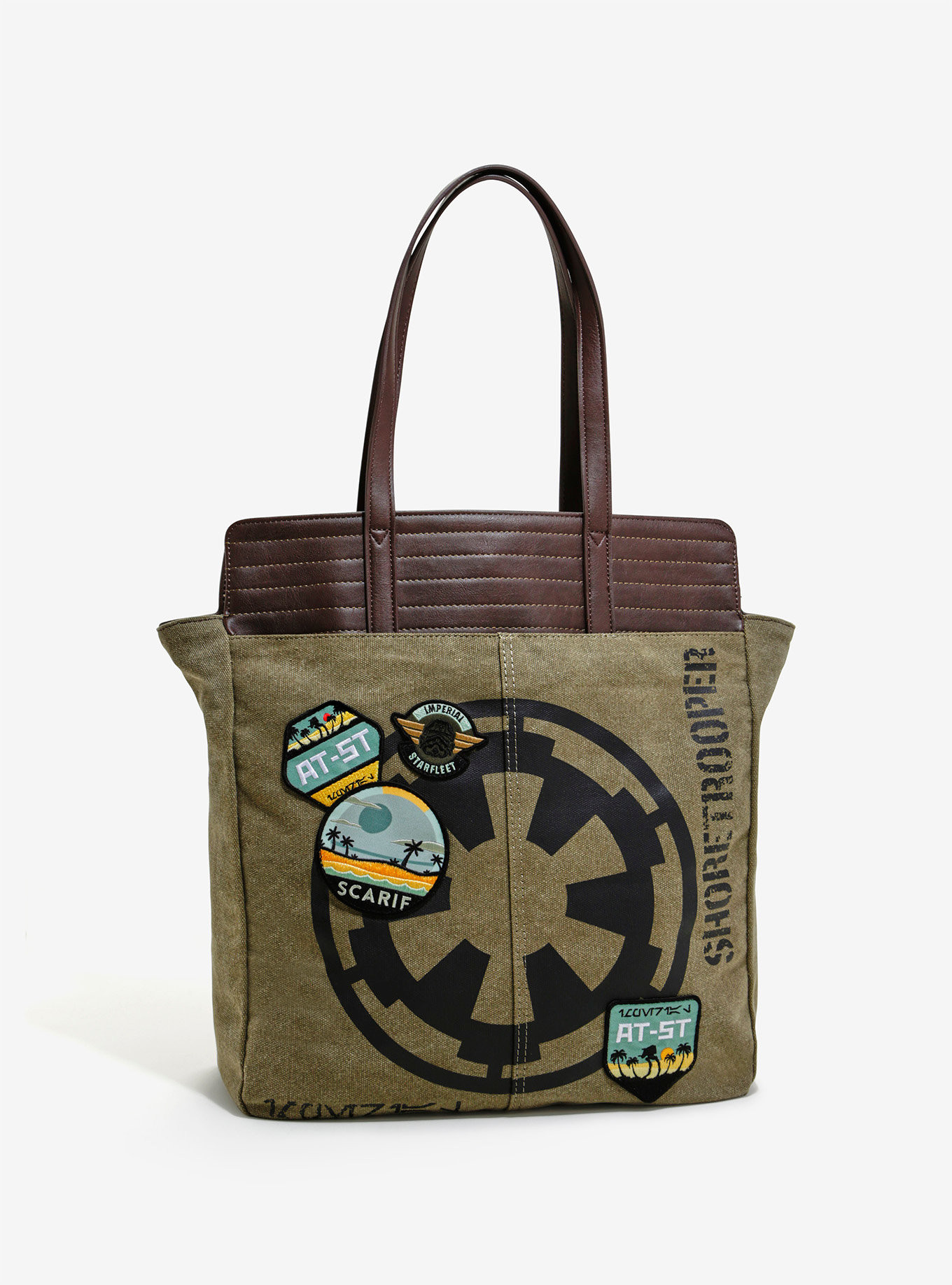 Whether you support the Imperial Starfleet or the Rebel Alliance, you need this handbag. This brown canvas and faux leather rugged style tote features authentic chenille patchwork. Internal zip and drop pockets, snap closure.