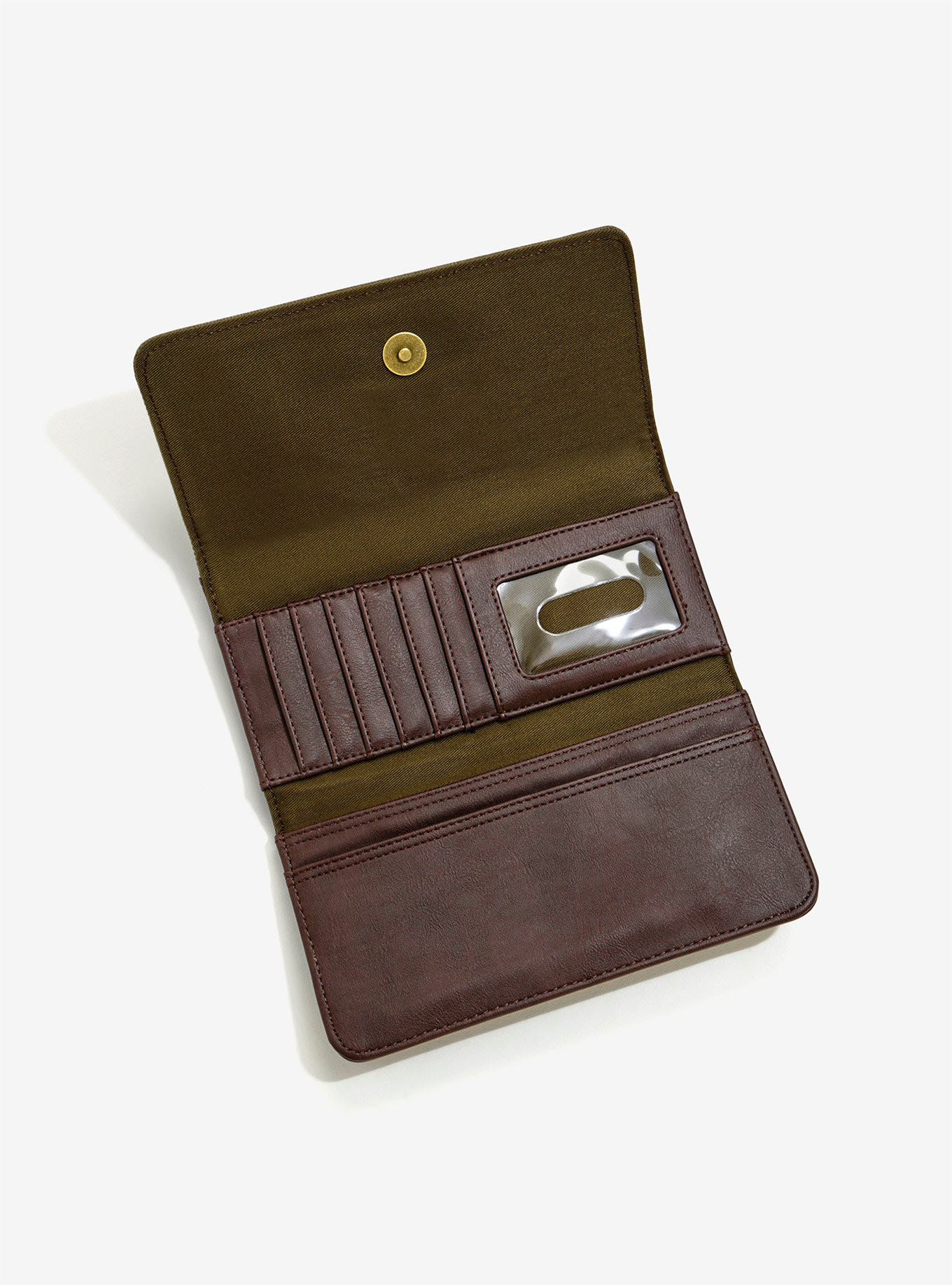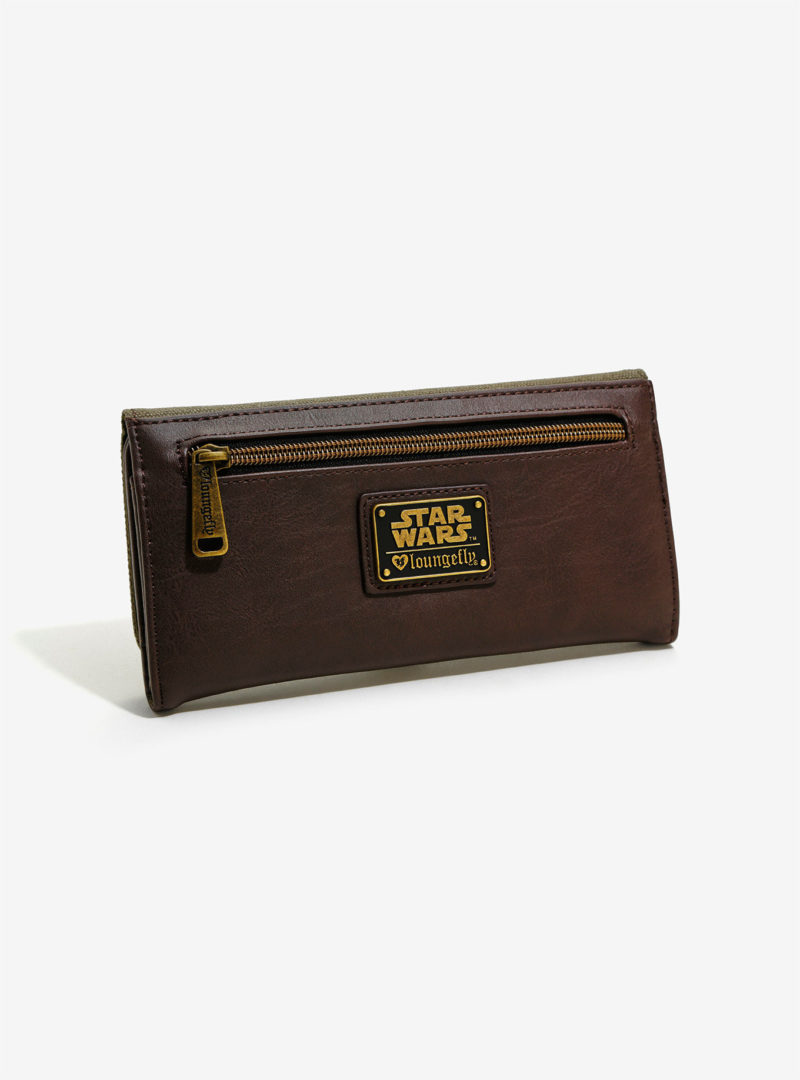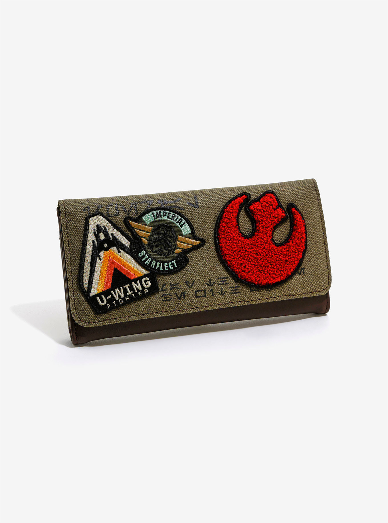 Whether you support the Imperial Starfleet or the Rebel Alliance, you need this wallet. This brown canvas and faux leather rugged style wallet features authentic chenille patchwork. Snap closure, 2 cash slots, 6 card slots and ID window, plus external zipper pocket.