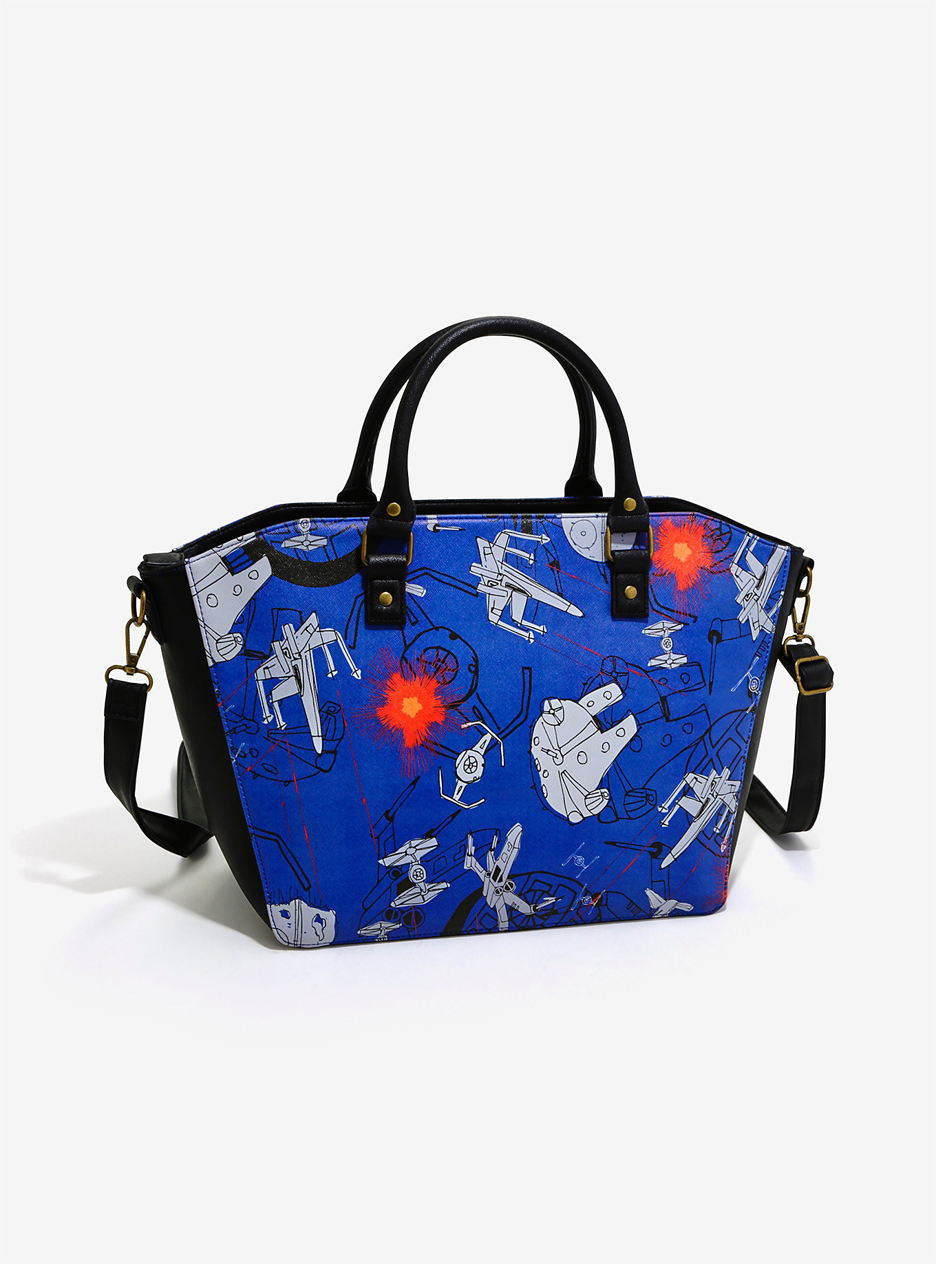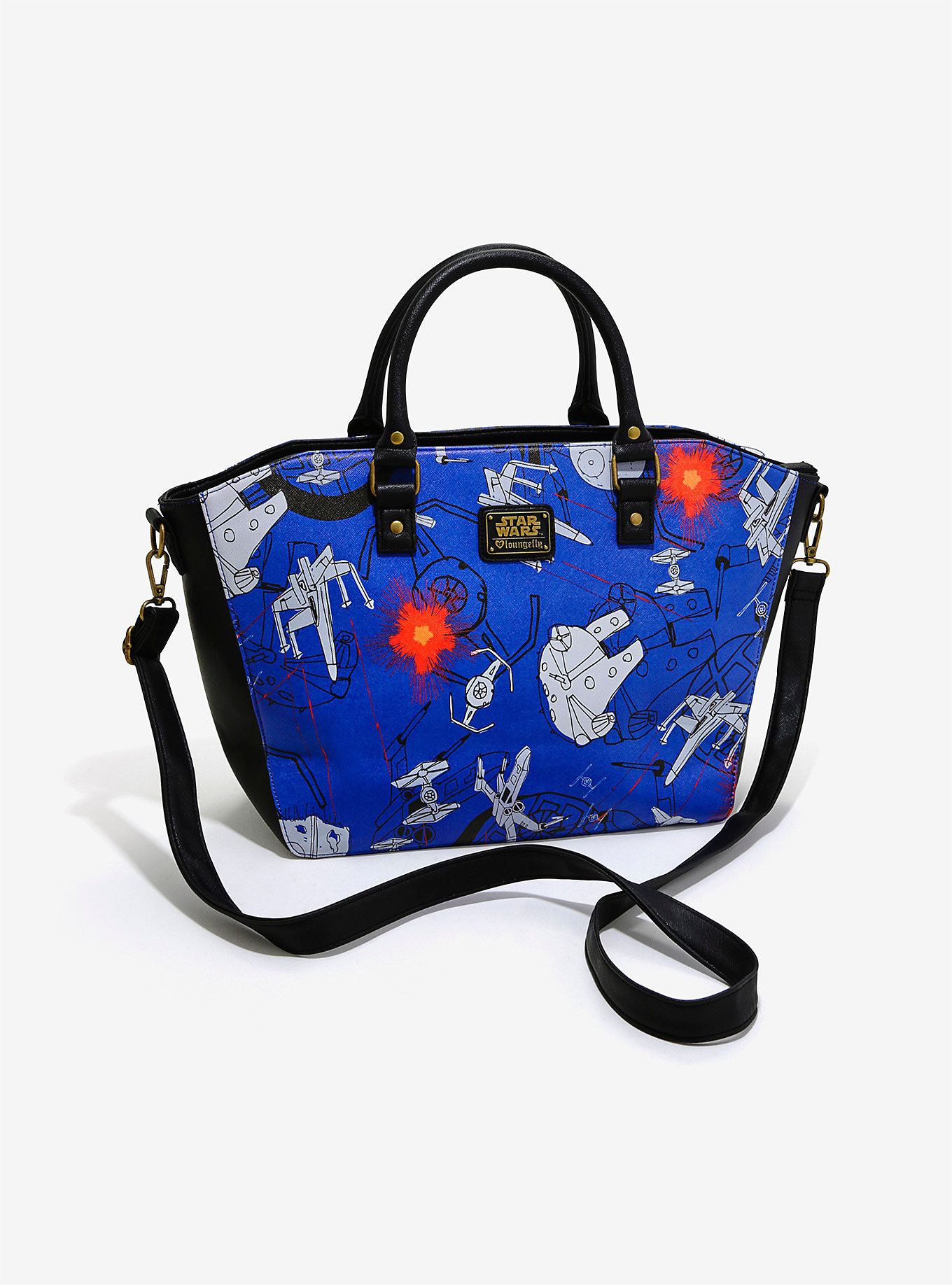 We love how this bag from Loungefly and Star Wars looks like a little kid drew a fighter battle scene! The blue and black faux leather bag has an allover print with black side panels, black rolled handles and an optional black faux leather crossbody strap. Inside the zipper closure is a pouch pocket and zipper pocket. It’s the perfect size to store your lightsaber when not in use!