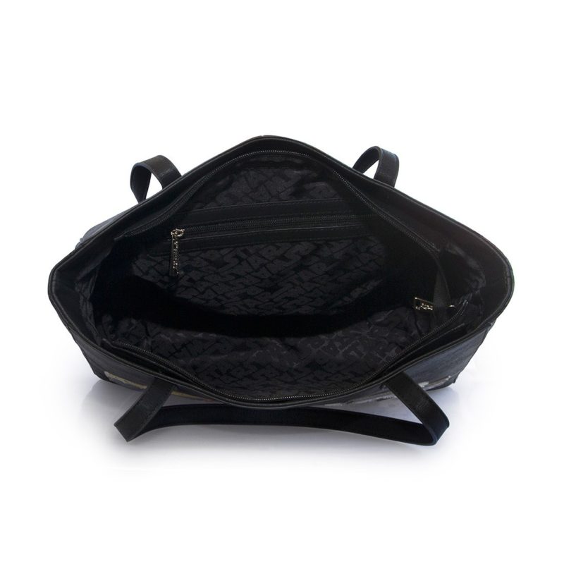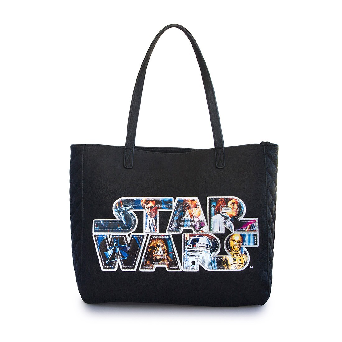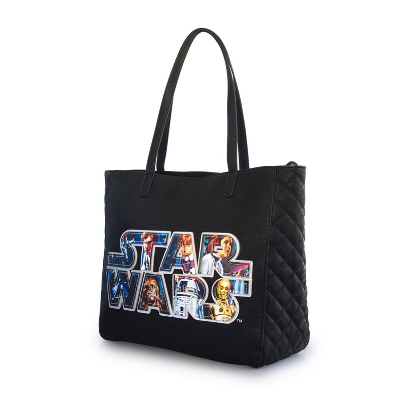 The first is a Star Wars logo applique design, which features artwork from the classic A New Hope poster by Tom Chantrell. The bag and wallet are both made from black faux leather, with quilted panels. I love colourful contrast against the black background, the depth of the applique gives a great 3D effect. This applique logo design is available as a tote bag (priced at US$60.00 each), and women’s wallet (US$38.00 each).