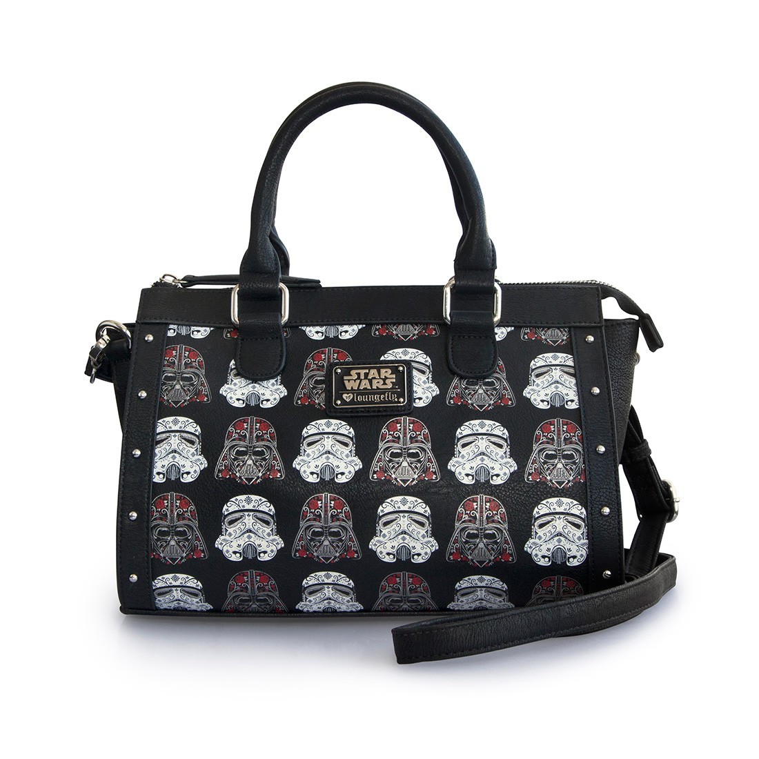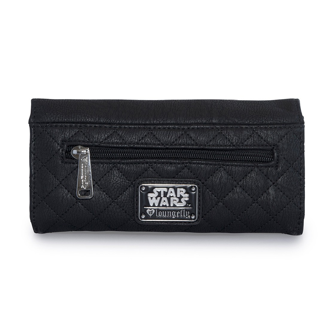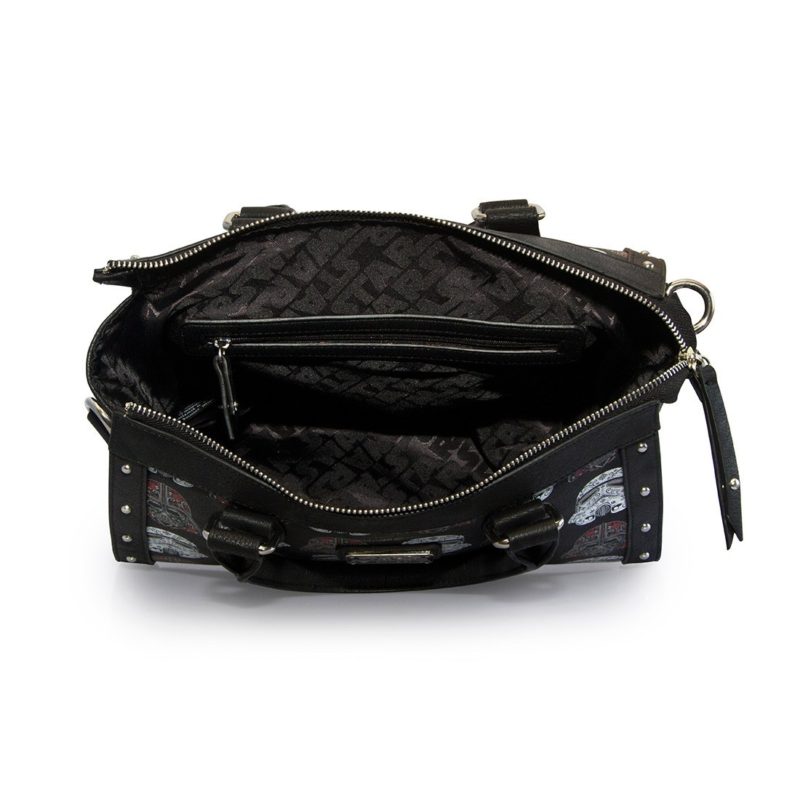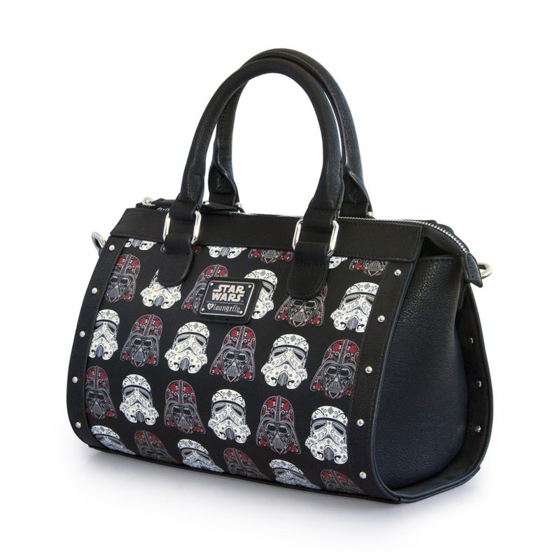 The second new design is a ‘Sugar Skull’ style repeating print of Stormtrooper and Darth Vader helmets. The sugar skull Stormtrooper and Darth Vader designs have been used on earlier Loungefly x Star Wars items (like the Stormtrooper handbag I reviewed here), they work so well together as a smaller repeating print. I love the metal stud details on the bag, and while the wallet is smaller, the detail is still included on the zipper pull. This design is available as a duffle style handbag (priced at US$70.00 each), and women’s zip up wallet (priced at US$38.00 each).