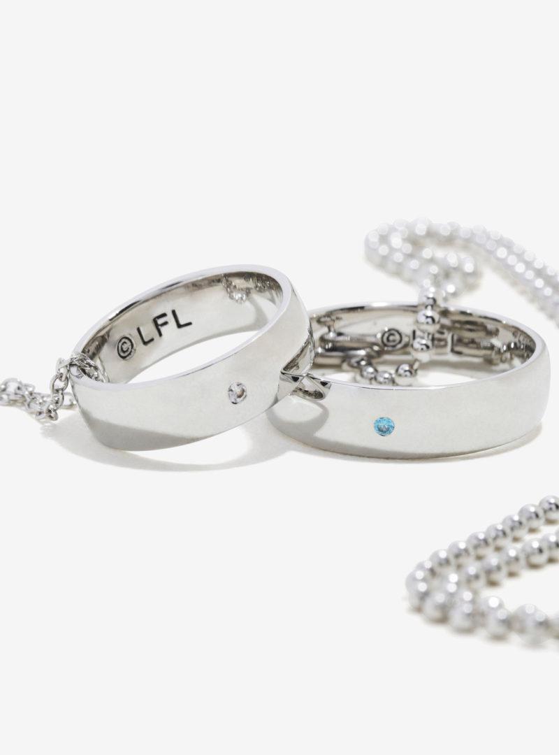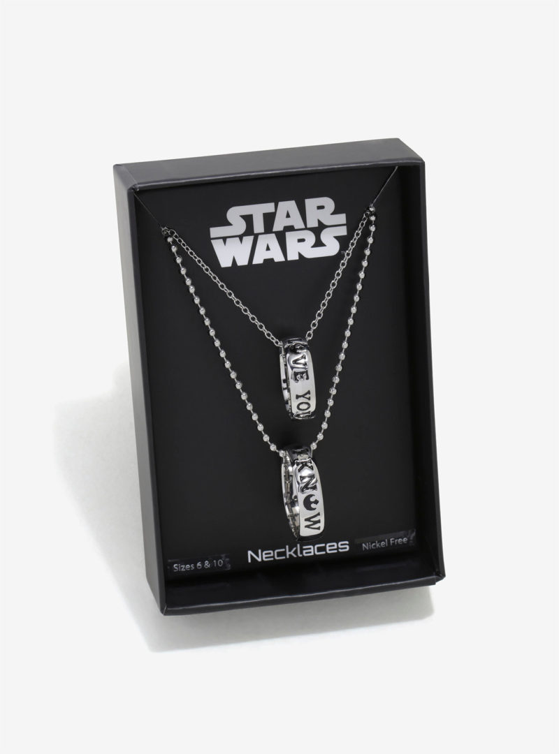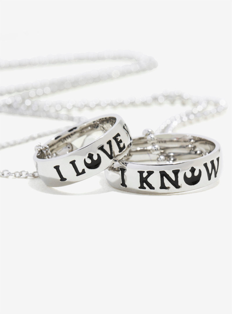 This new Star Wars ring necklace set is now available at Box Lunch. The set contains 2 rings, each hung on a seperate necklace – one ring features the text ‘I Love You’, while the other features the text ‘I Know’. Both rings have the Rebel Alliance ‘starbird’ symbol in the place of an ‘O’, and they also have a small rhinestone set into the back of each band.