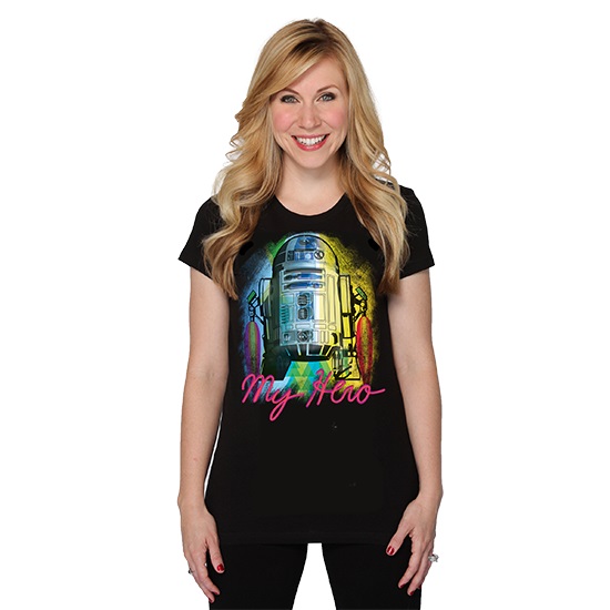 Her Universe has revealed a new R2-D2 t-shirt that will debut at D23 Expo. The women’s black t-shirt features a colourful R2-D2 print (with his side jets as seen in Ep2/Ep3) and the pink text ‘My Hero’. The announcement mentions ‘new exclusives’ but doesn’t specify if this R2-D2 shirt is exclusive or will also be available on-line. As well as the new t-shirt, Her Universe will have other recent items available, including the lightsaber skirt, X-Wing and High Commander cardigans, Hoth and Bespin pin up dresses, and the ewok hooded tank top. This is the first time Her Universe has been at D23 – read the full announcement at Her Universe’s blog here.