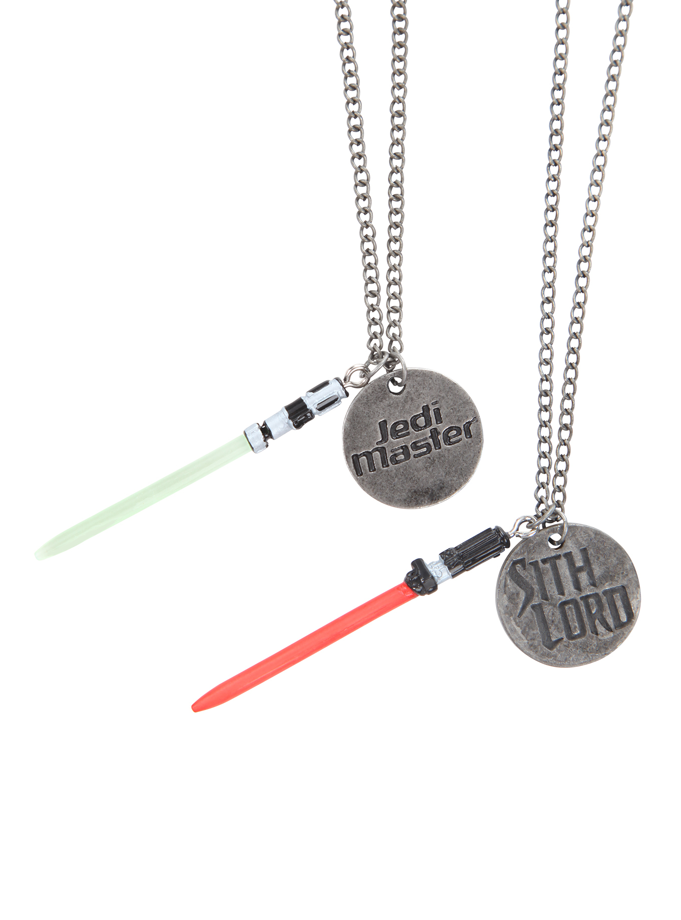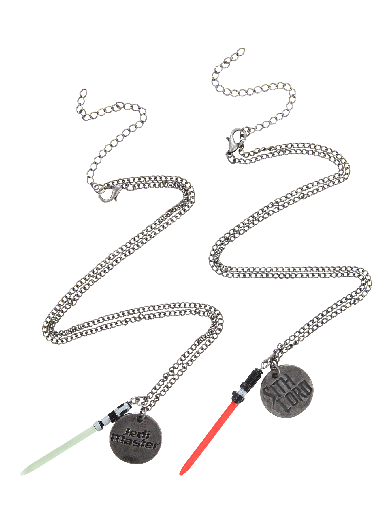 Hot Topic has a new lightsaber necklace set available. The set includes two adjustable necklaces – one features a Yoda lightsaber pendant and a ‘Jedi Master’ circular pendant, while the other features a Darth Vader lightsaber pendant and a ‘Sith Lord’ pendant. The set is priced at US$10.50 – Hot Topic can ship internationally.