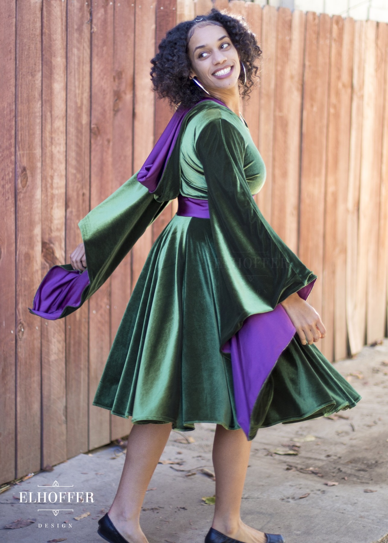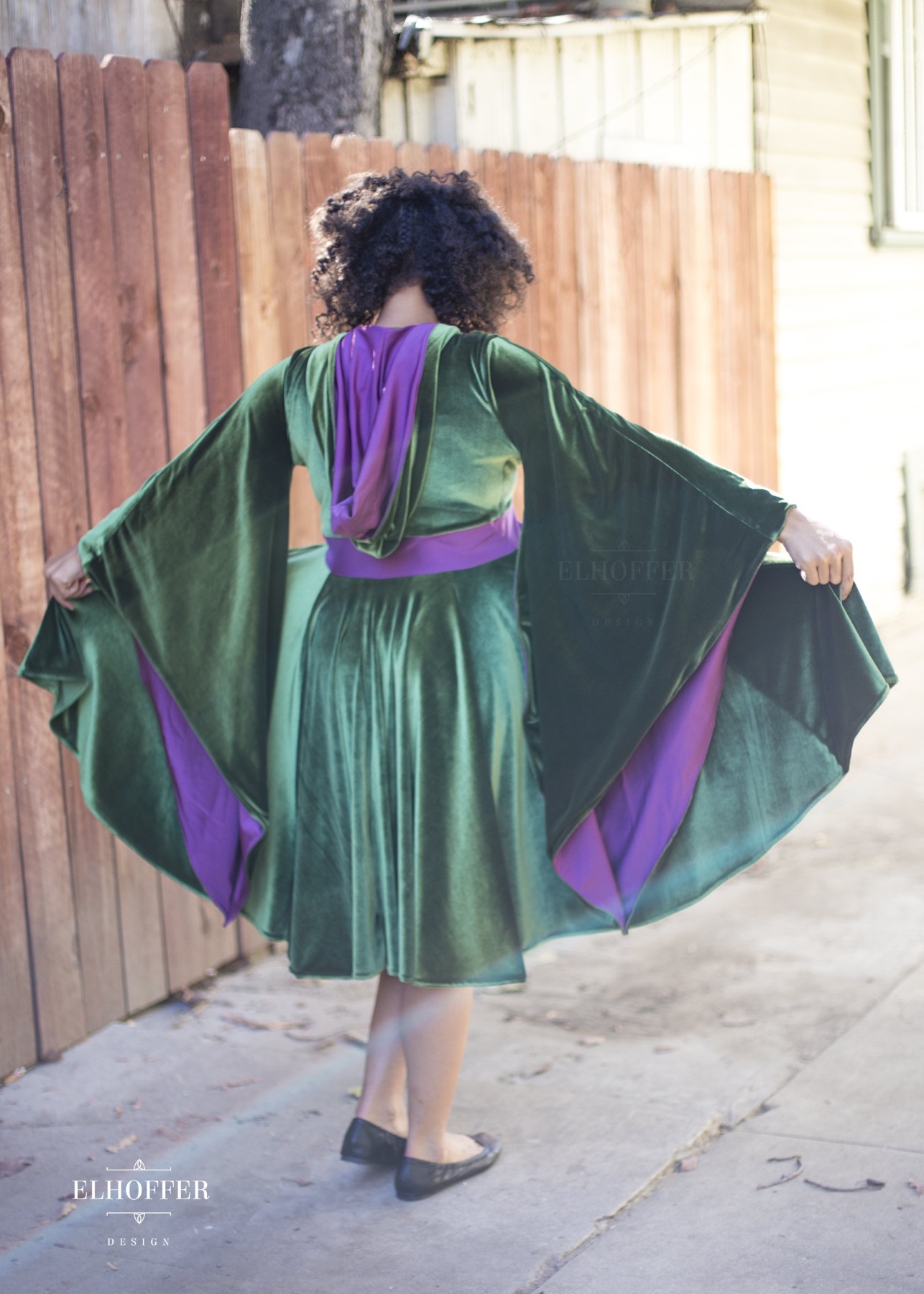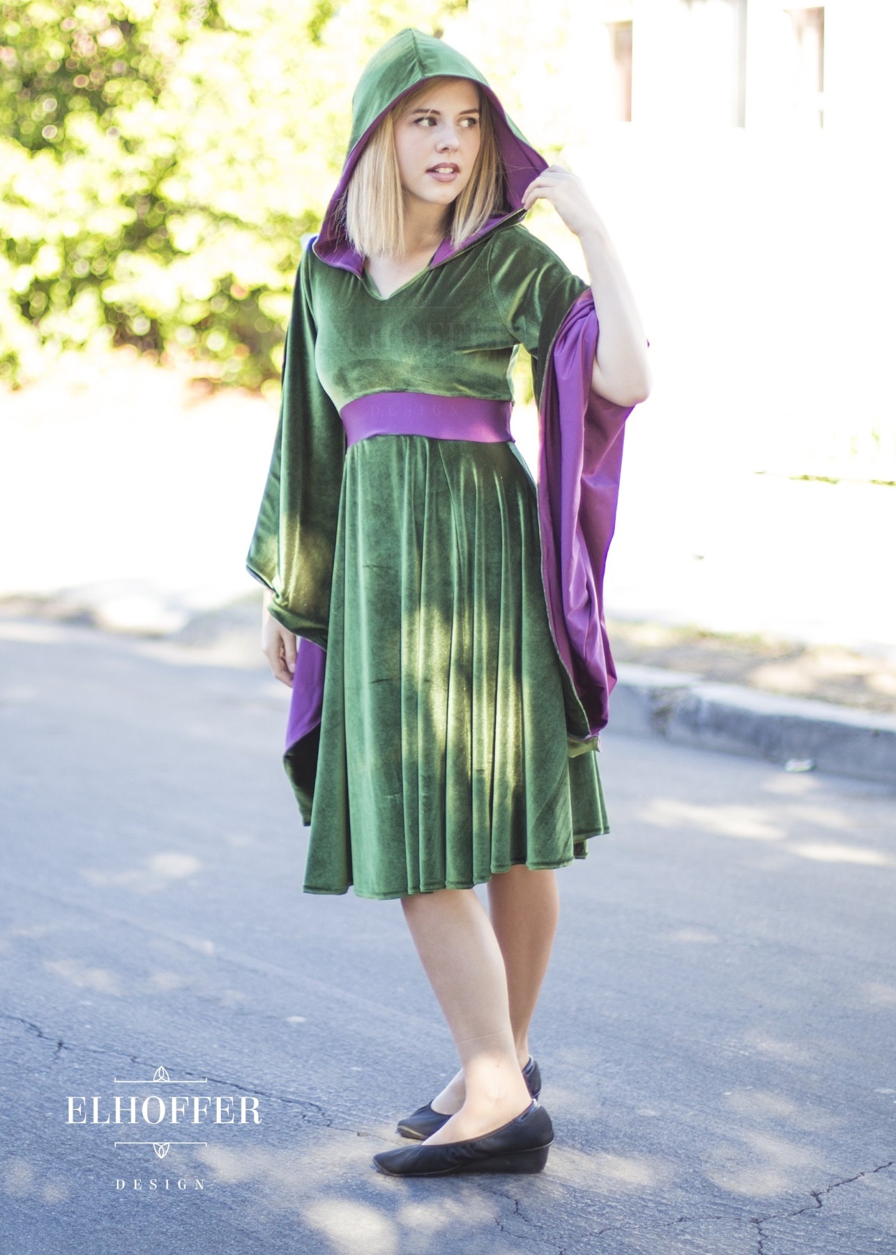 This beautiful Padme’ Amidala velvet dress is now available for pre-order from Elhoffer Design! Inspired by the ‘green cut velvet’ dress Padme’ wears in Revenge Of The Sith, this ‘everyday cosplay’ style interpretation includes a full skirt, draped sleeves, and hood.