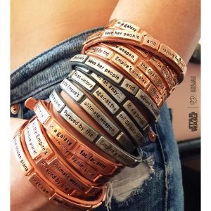 While the original Star Wars crawl wrap bracelet is shipping soon, Love And Madness has previewed an upcoming colour variant – gold! Also, I believe the middle bracelet in the photo is a black/silver version – whereas the version currently available is black/gold. I can’t decide which version I like best – I’m not usually drawn to gold-tone jewelry (prefer white gold myself), but that rose gold colour combination is really quite striking! No information yet on when these upcoming designs will be released – though I’m kinda hoping Love And Madness space out the releases of their wrap bracelets to give fans enough time to save up for all the versions they love! Seeing three wrap bracelets worn together, it would be awesome to get a full trilogy set to wear together – original, or prequel, and perhaps even eventually episodes 7, 8 and 9!