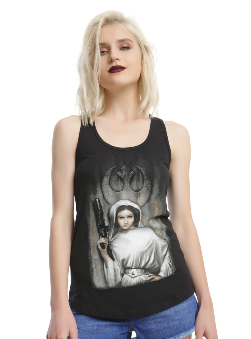 Hot Topic has a new women’s Princess Leia tank top available. Made from 60% cotton, 40% polyester, the black racerback tank top features a front print of Princess Leia holding a Stormtrooper blaster and the Rebel Alliance symbol behind her. The gorgeous artwork is by Jerry Vanderstelt – the art print is still available to buy from Acme Archives.