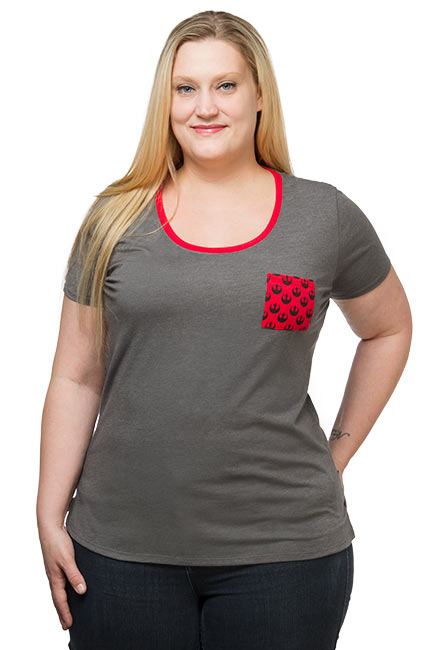 Thinkgeek - women's plus size Rebel pocket tee (front) Thinkgeek - women's plus size Rebel pocket tee (front detail)